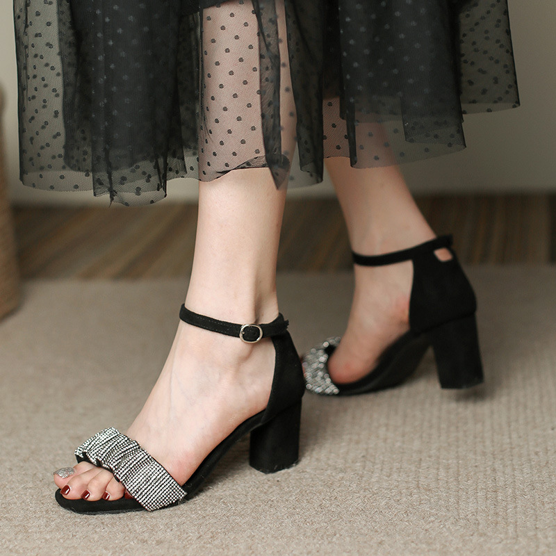 여성 의상 2024 샌들, 라인스톤을 곁들인 여름 새 여성 소프트 솔 올 매치 두꺼운 힐 로마 캐주얼 여성 신발스토어 가기