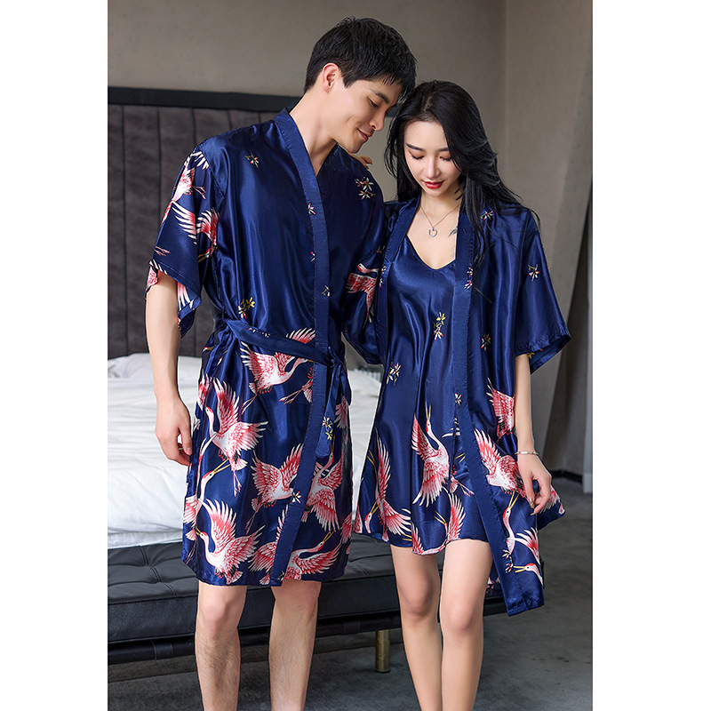 남자의 잠옷 여름 얇은 목욕 가운 잠옷 플러스 사이즈 크레인 아이스 실크 중간 길이 가정 옷 봄과 가을 패션 성격스토어 가기