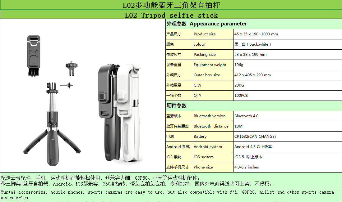 새로운 L02 블루투스 셀카 스틱 범용 휴대 전화 클립 다기능 라이브 방송 스탠드 GoPro 셀카 스틱 삼각대