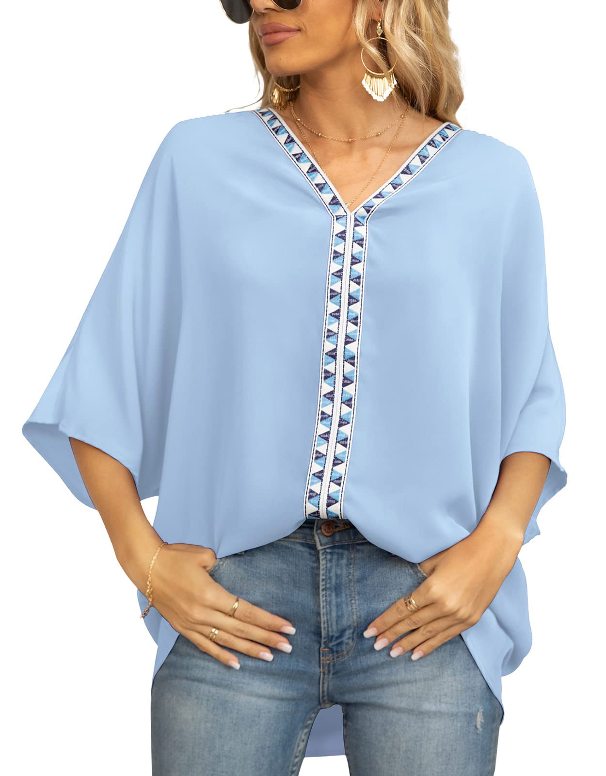 2023 아마존 폭발 유럽과 미국 여름 새로운 여성용 박쥐 슬리브 쉬폰 V-넥 반소매 셔츠 크로스 보더스토어 가기