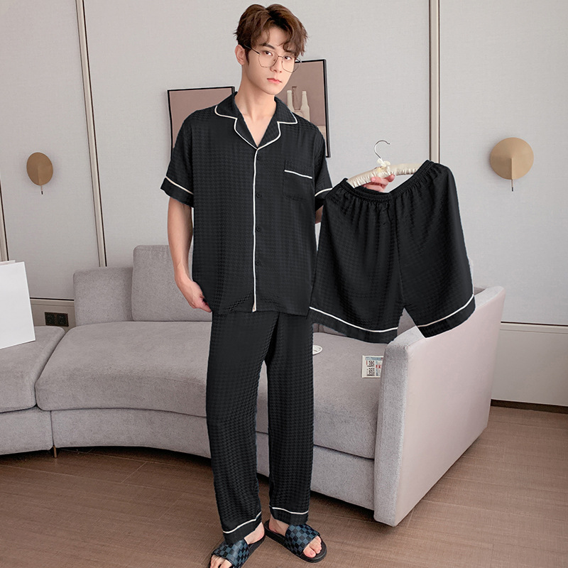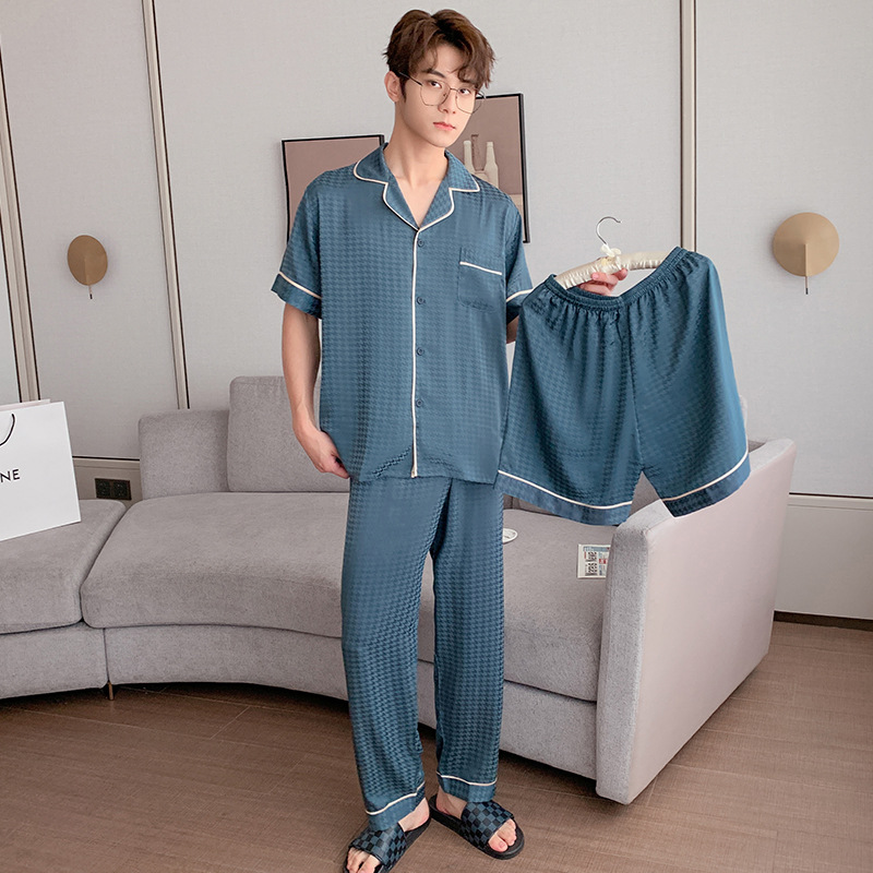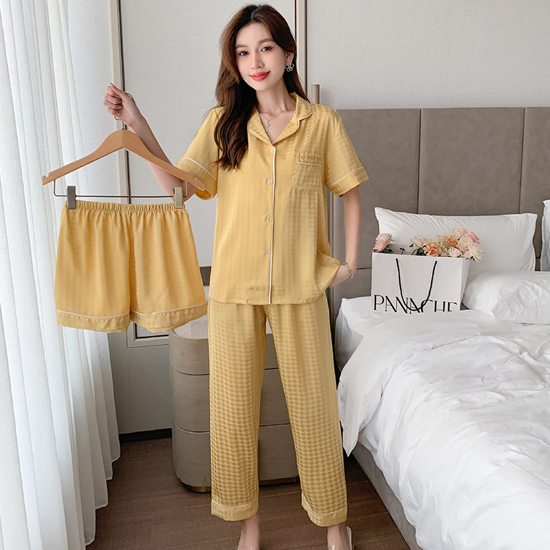커플 잠옷 봄과 가을 아이스 실크 하이엔드 반팔 반바지 팬츠 하운드투스 자카드 3 종 세트 3095 + N395