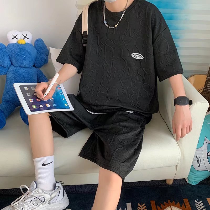 와플 반팔 티셔츠 남자의 여름 얇은 느슨한 청소년 캐주얼 남자의 세트 잘 생긴 옷 유행스토어 가기
