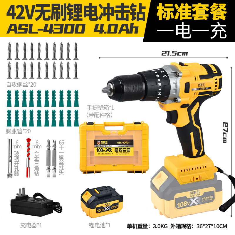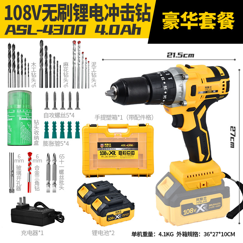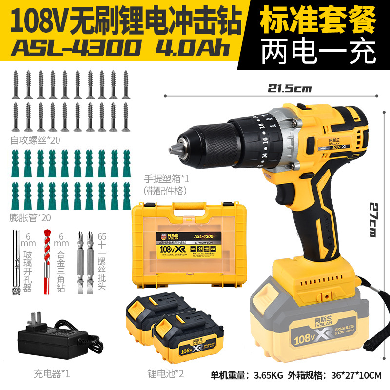 • 108V 고토크 리튬 전기 임팩트 드릴 ASL-4300(배터리 1개, 충전 1개) 4.0 표준 패키지