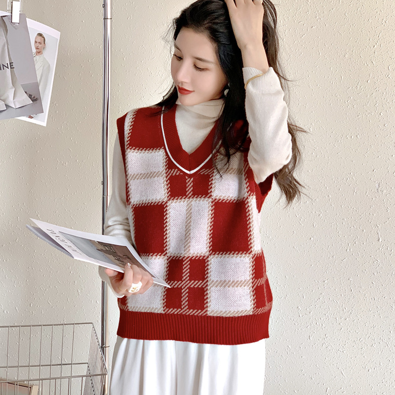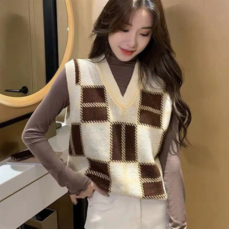 바둑판 니트 조끼 여성 의류 아우터 2023 새로운 스타일 스택 조끼 스웨터 아우터웨어 V-넥 조끼 다이아몬드 조끼스토어 가기