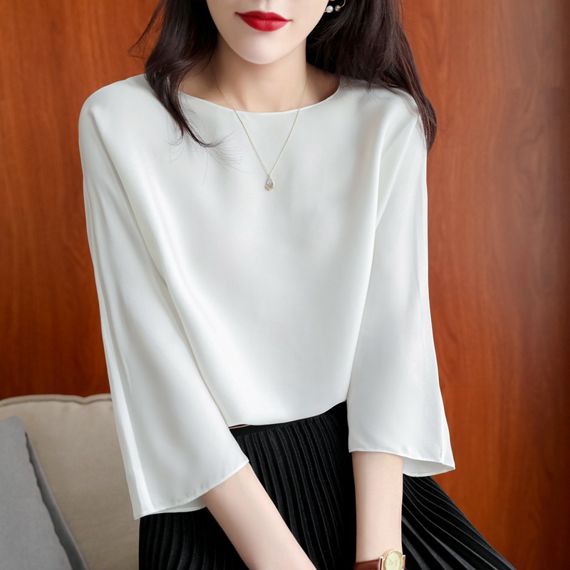 真丝上衣女桑蚕丝衬衫缎面圆领t恤气质七分袖2021新款宽松大码夏