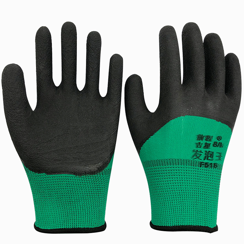 Qiancheng Lucky 브랜드 13 핀 녹색 검은 거품 반 교수형 고무 장갑 내마모성 미끄럼 방지 통기성 젖빛 검은 거품 장갑
