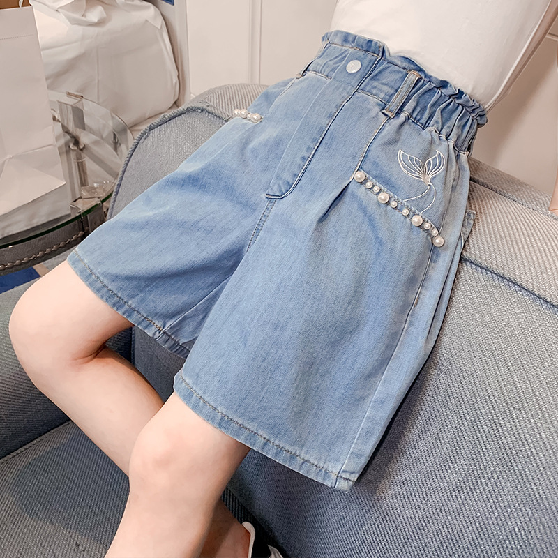 여아 물고기 꼬리 진주 데님 반바지 2022 여름 신상품 한국 스타일 얇은 사이버 연예인 미디엄 팬츠