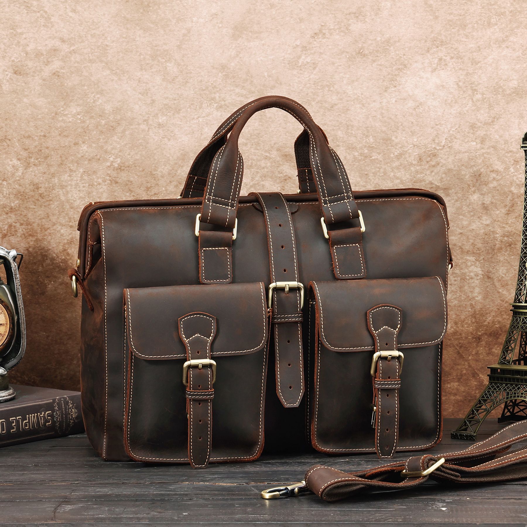 정품 가죽 서류 가방 남성용 가방 대용량 15.6 인치 싱글 숄더 컴퓨터 가방 크레이지 호스 가죽 레트로 휴대용 남성용 비즈니스 가방