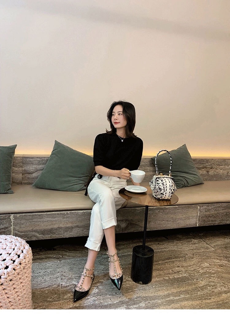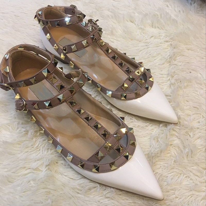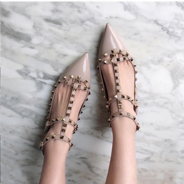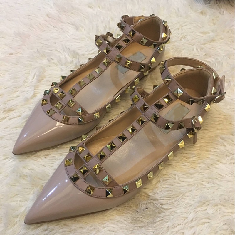 고고정 벨트 표준 유럽 및 미국 V 홈 리벳 뾰족한 플랫 슈즈 특허 가죽 얕은 발 고리 T 자형 스트랩 Liu Ding 슈즈 단층 신발스토어 가기