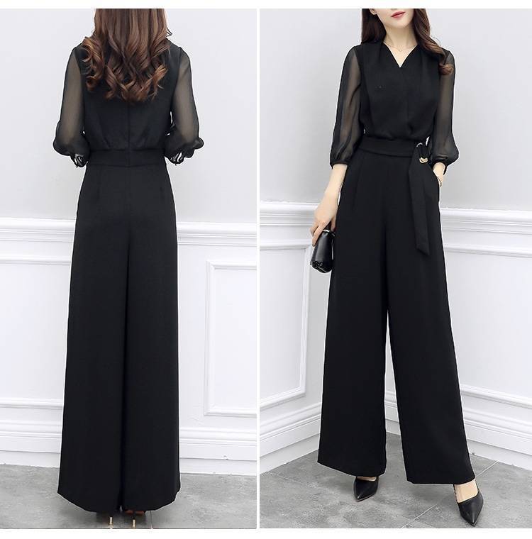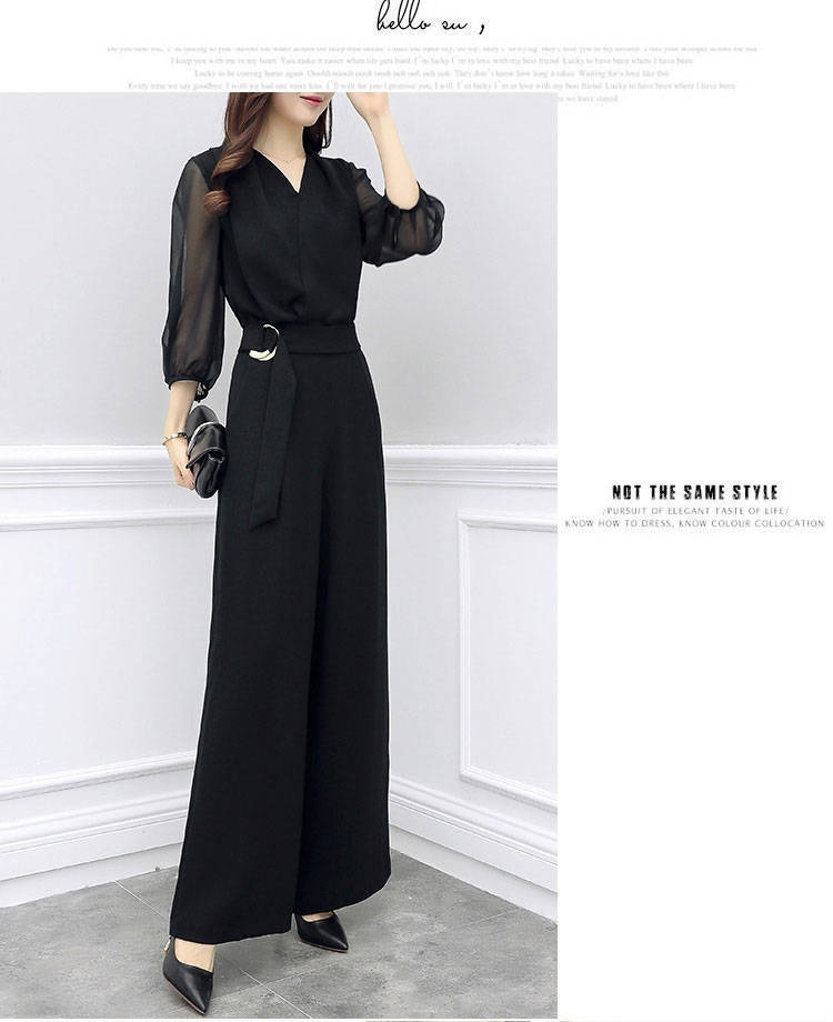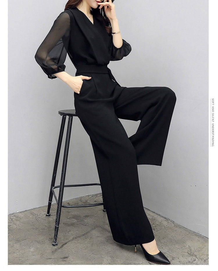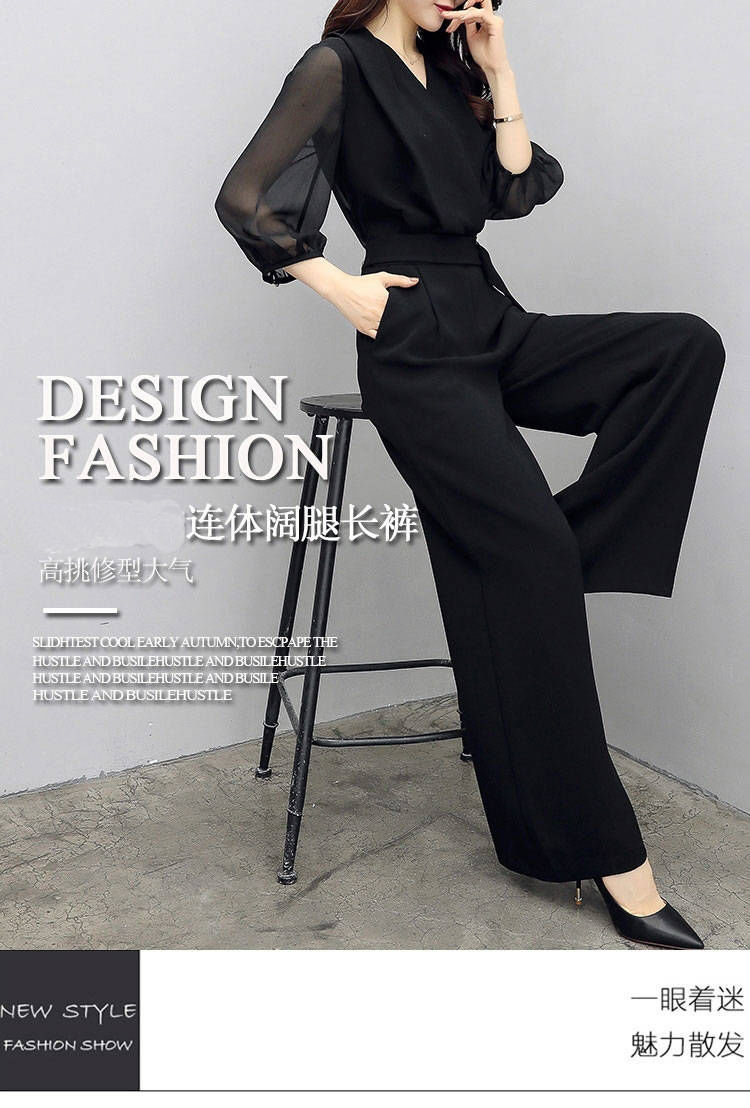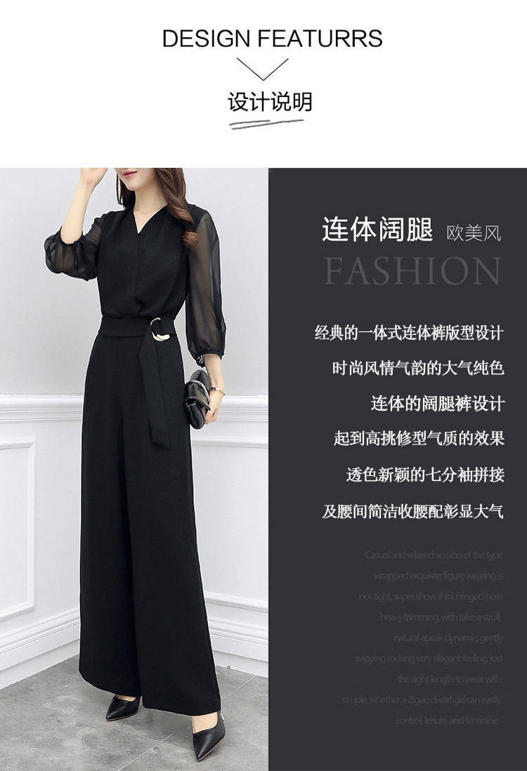 봄과 여름 새로운 하이 웨이스트 캐주얼 점프 슈트 블랙 크롭 슬리브 슬림 핏 슬리밍 우아한 와이드 레그 점프 슈트 세트 여성스토어 가기