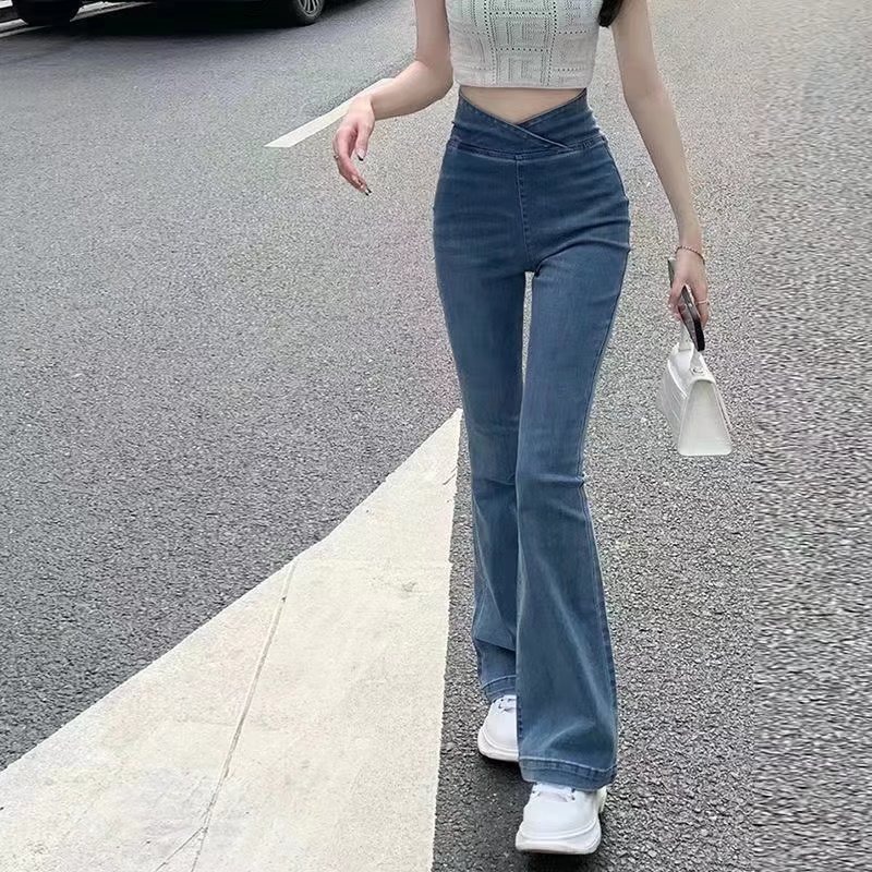 빈티지 블루 하이 웨이스트 마이크로 블레이저 청바지 여성용 2022 봄과 여름 새로운 스파이스 걸 스트레치 슬림 플레어 팬츠 트렌디스토어 가기