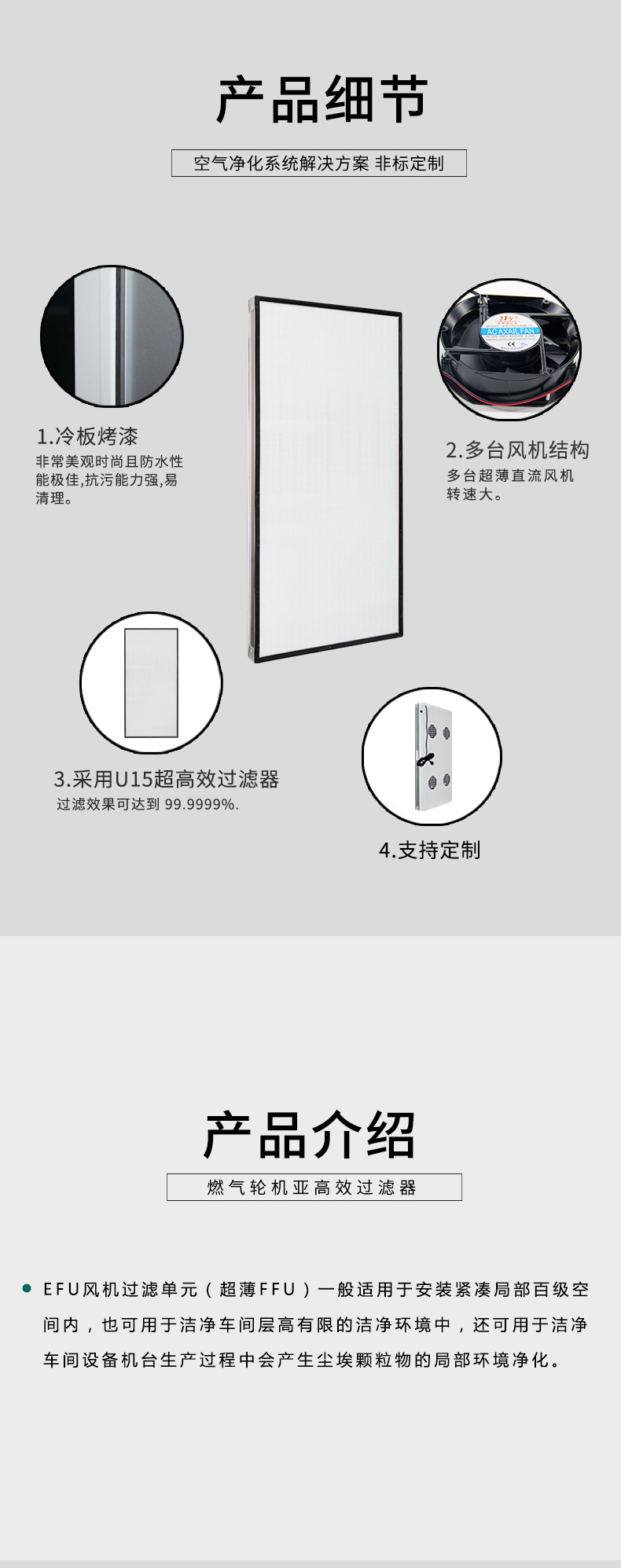 방폭형 초박형 EFU 팬 필터 장치 FFU 클래스 100 클린 의료 실험 U15 초고효율 공기 필터링