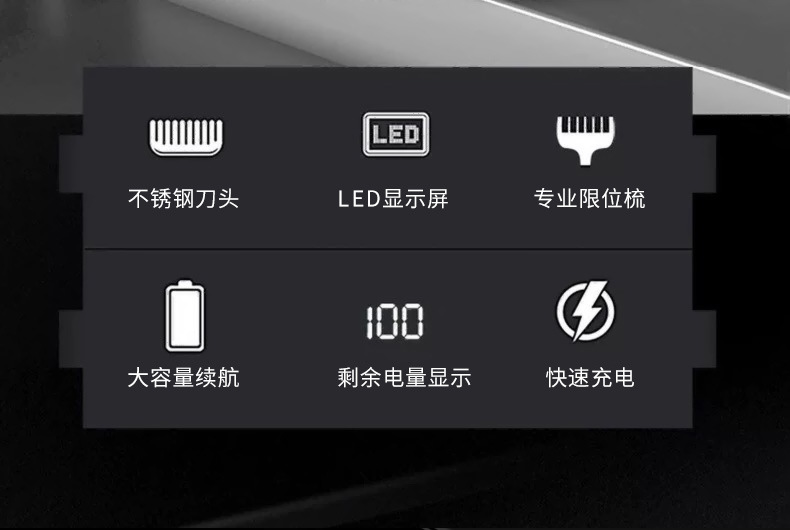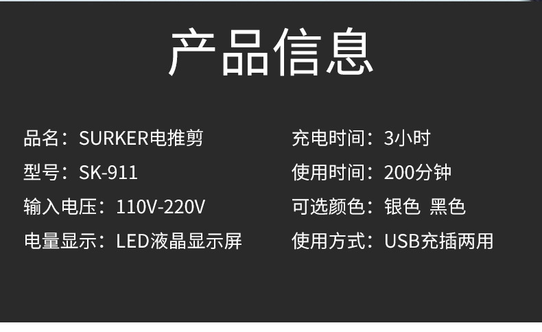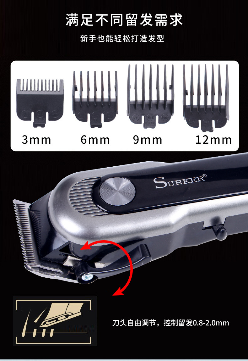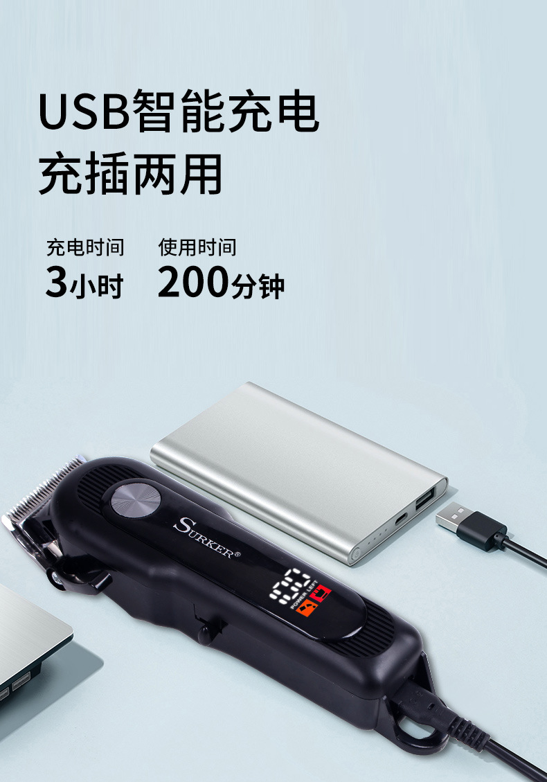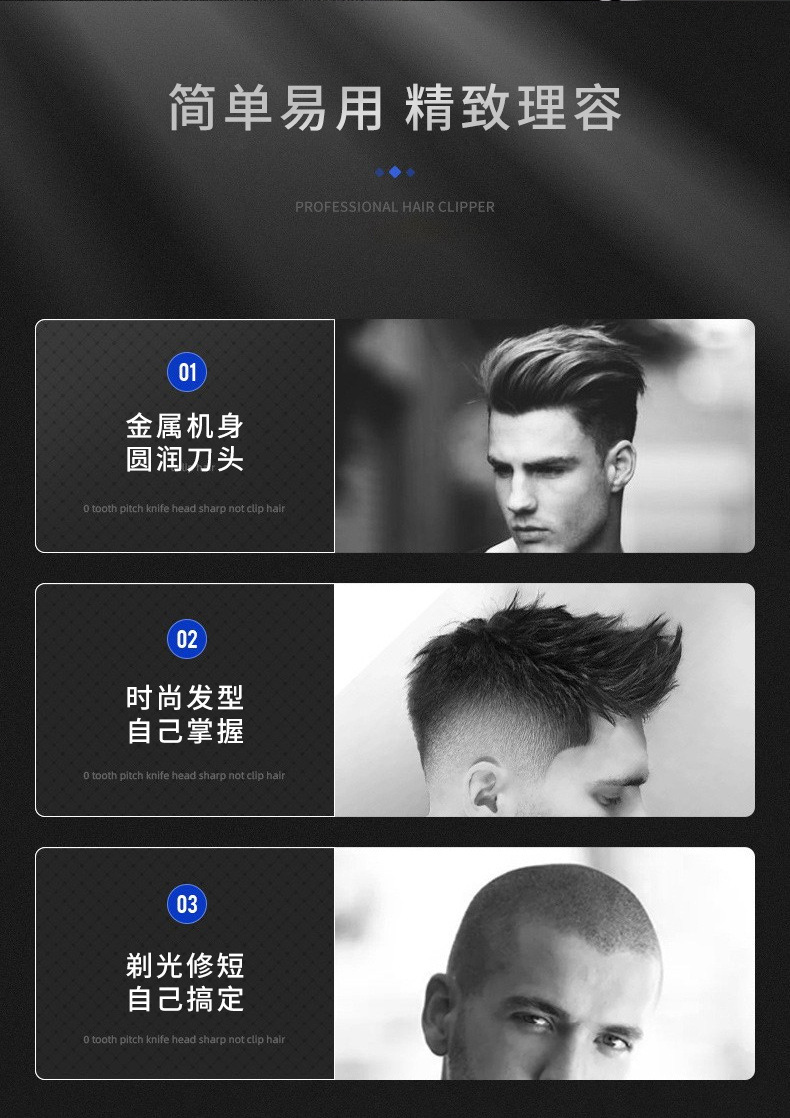 产品卖点:防滑纹设计,复古油头雕刻剪,黑银双色可选,USB快速充电,推动式开关,R角防护刀头,充插两用,刀头可微调,液晶电量显示