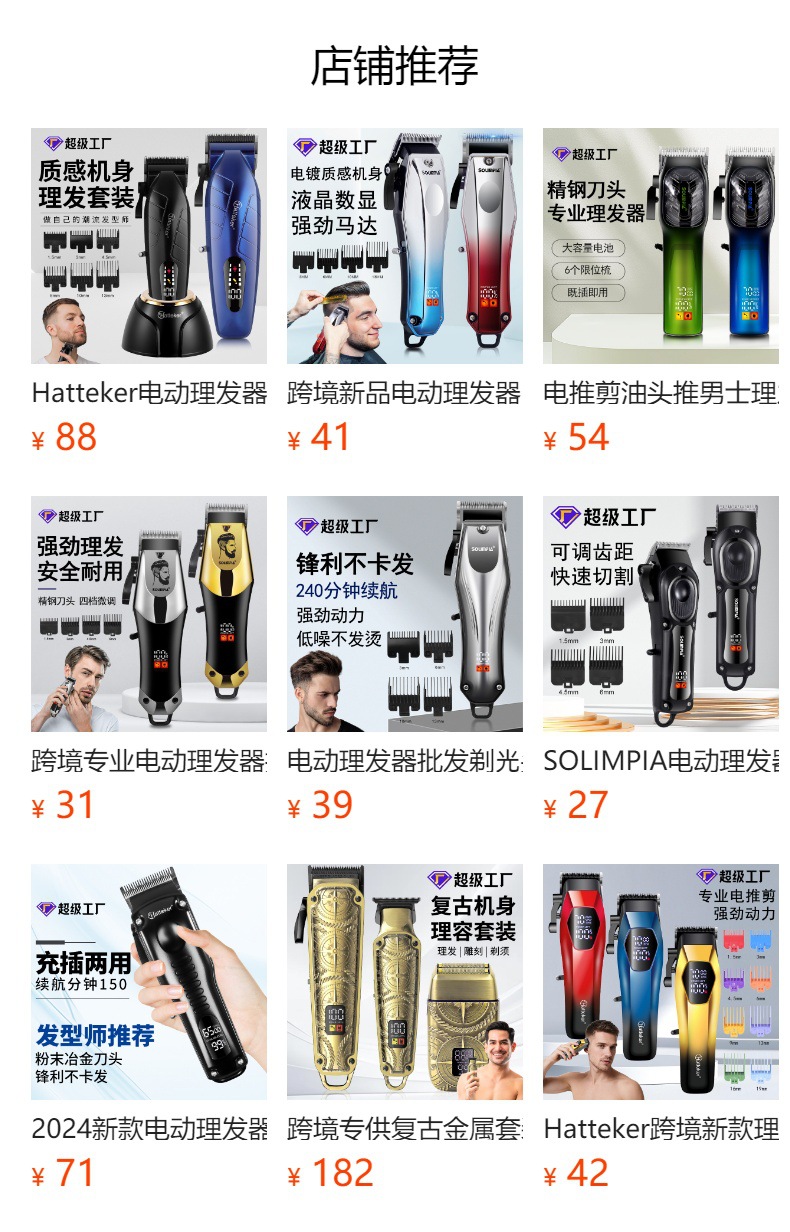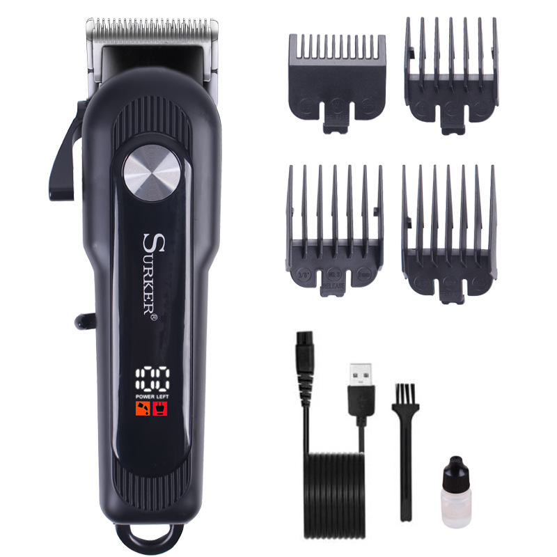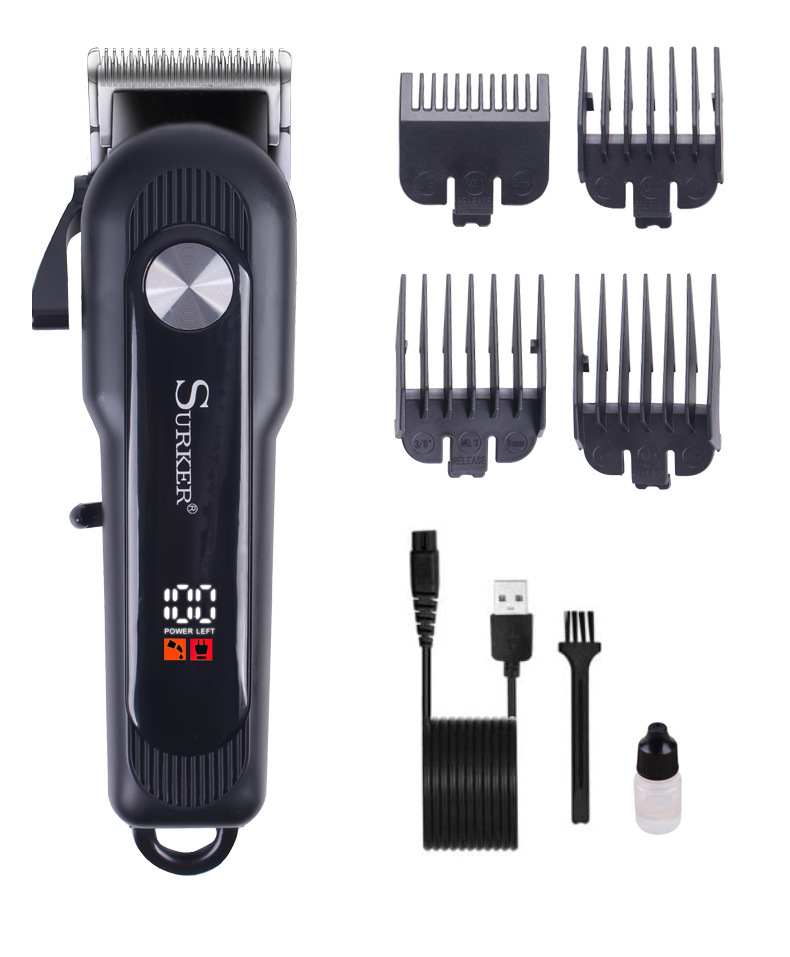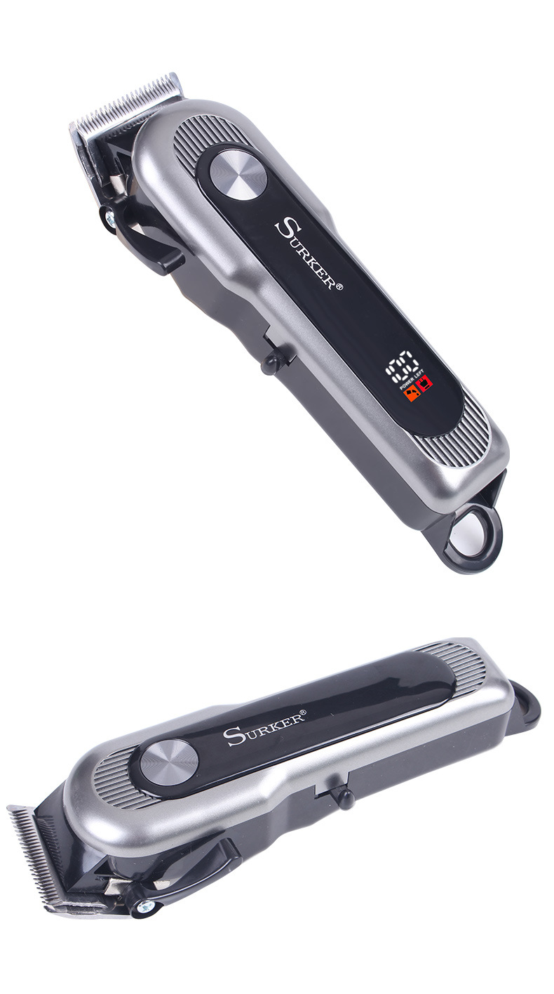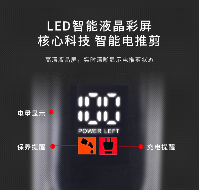产品卖点:防滑纹设计,复古油头雕刻剪,黑银双色可选,USB快速充电,推动式开关,R角防护刀头,充插两用,刀头可微调,液晶电量显示