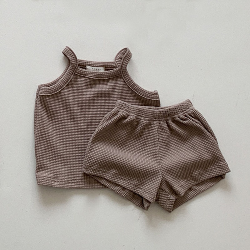 한국 스타일 아동복 아기 소년과 소녀의 여름 얇은 면 피부 친화적 인 아기의 와플 슬링 반바지 세트
