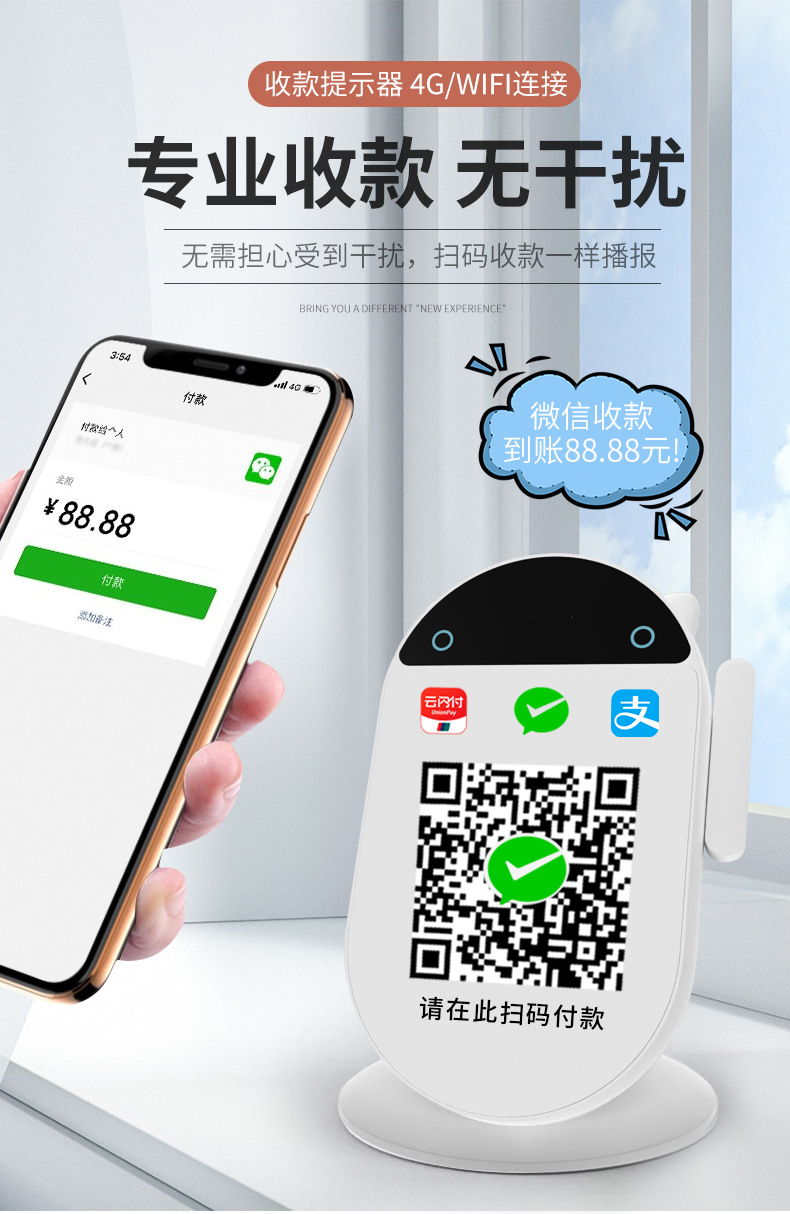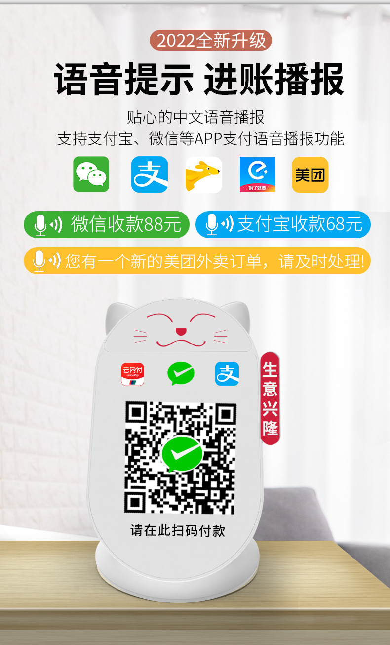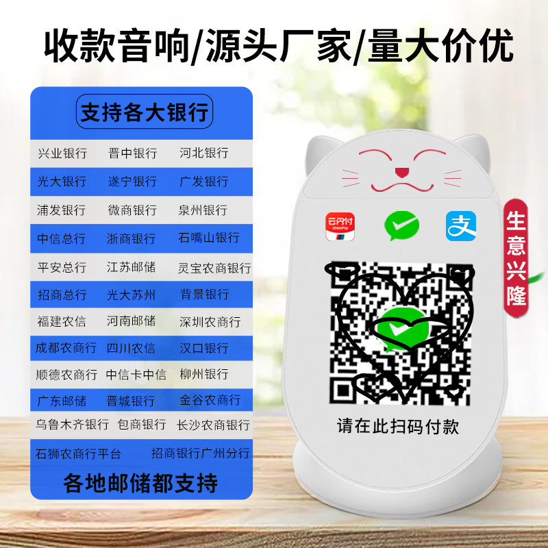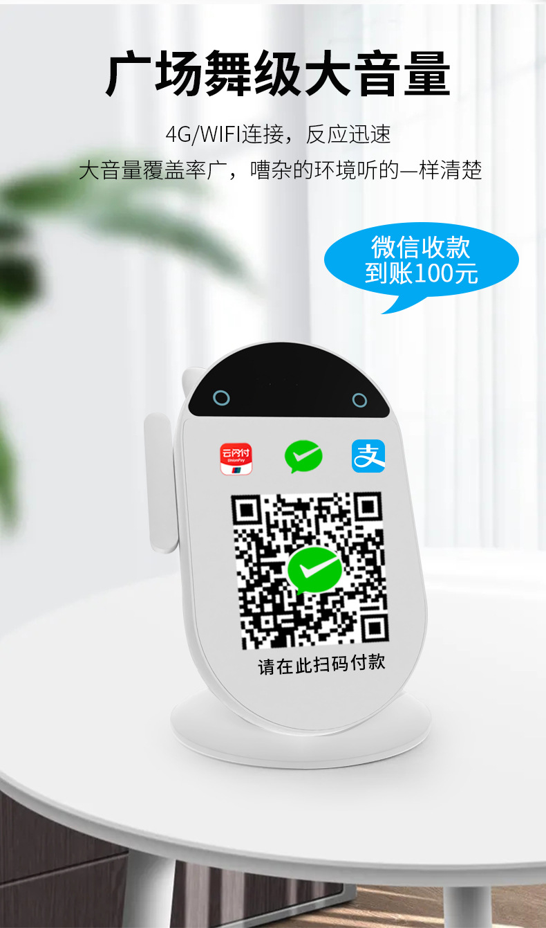 第5代新款云喇叭。外观尺寸165*11CM,喇叭尺寸;52 wifi收款音箱 ,4G收款音箱,WiFi版连接WIFI或者手机热点、都可正常运行,4G流量卡内置手机号码,只需绑定机器就可以使用。只需0.3秒以内就可以收到播报声音。颜色、LOG可以定制。欢迎第三方、第四方通道,银行通道合作,我们也可以给顾客提供第三方通道公司合作。产品已打通移动物联网平台MQTT,可对接银行, 第三方、第四方通道