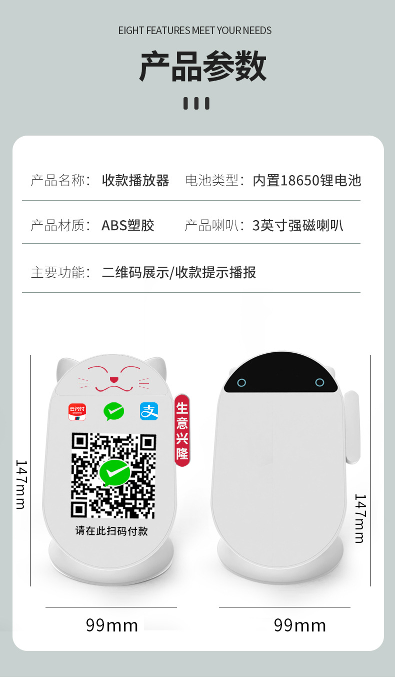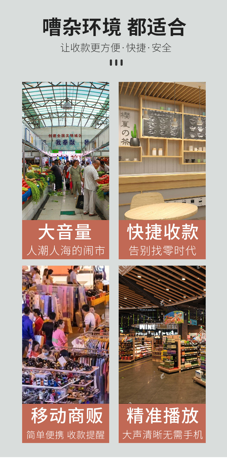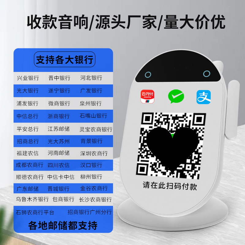 第5代新款云喇叭。外观尺寸165*11CM,喇叭尺寸;52 wifi收款音箱 ,4G收款音箱,WiFi版连接WIFI或者手机热点、都可正常运行,4G流量卡内置手机号码,只需绑定机器就可以使用。只需0.3秒以内就可以收到播报声音。颜色、LOG可以定制。欢迎第三方、第四方通道,银行通道合作,我们也可以给顾客提供第三方通道公司合作。产品已打通移动物联网平台MQTT,可对接银行, 第三方、第四方通道