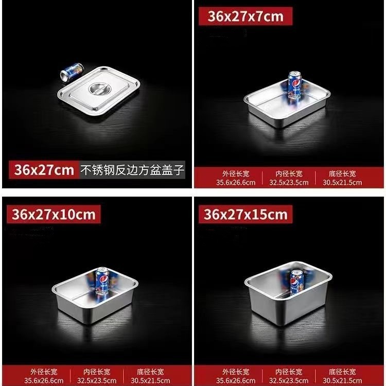 【产品特点】;不锈钢方盆采用优质加厚无磁不锈钢,一体拉抻成型,卷边紧致不刮手,安全卫生,盖子厚实可防尘保温,更健康,全套采用电解处理表面,更耐腐蚀,是家居和餐厅食堂后厨的理想用品,欢迎合作!