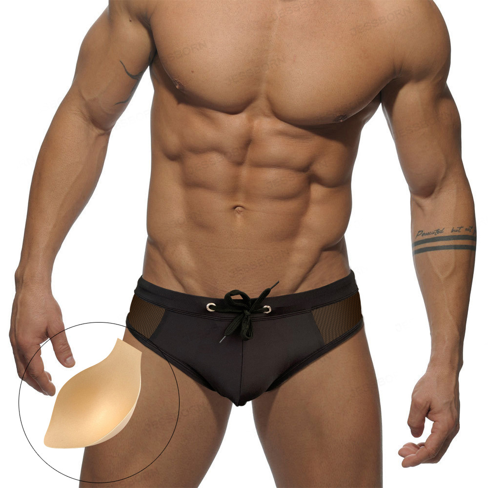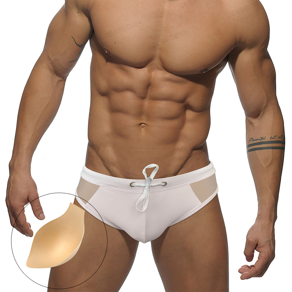 JESSBORN 남성용 단색 삼각형 수영 트렁크 사이드 메쉬 중공 패션 뜨거운 봄 바지 컵 맞는 섹시한 수영복