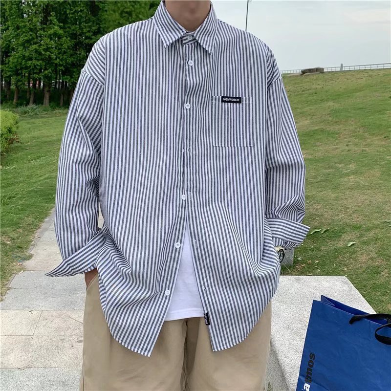 일본식 레트로 스트라이프 긴팔 셔츠 남성용 홍콩 스타일 트렌디 루즈한 캐주얼 베이스 셔츠 봄과 가을 틈새 재킷스토어 가기