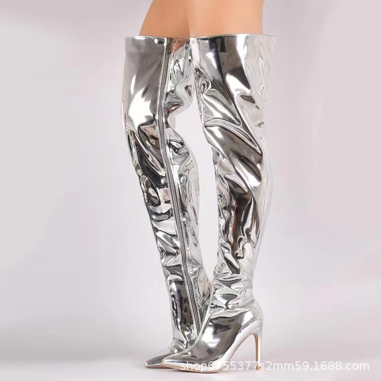 나이트 클럽 슈퍼 하이힐 스틸레토 지적 발가락 섹시한 거울 특허 가죽 여성 무릎 부츠 Catwalk 부츠 대형 하이힐