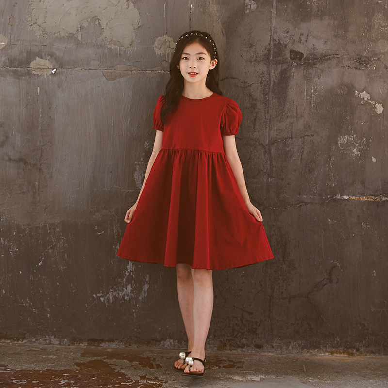 2024 여아 한국 스타일 원피스, 큰 아이들을 위한 뒷면 리본 나비넥타이 원피스, 여름 반팔 미디 원피스