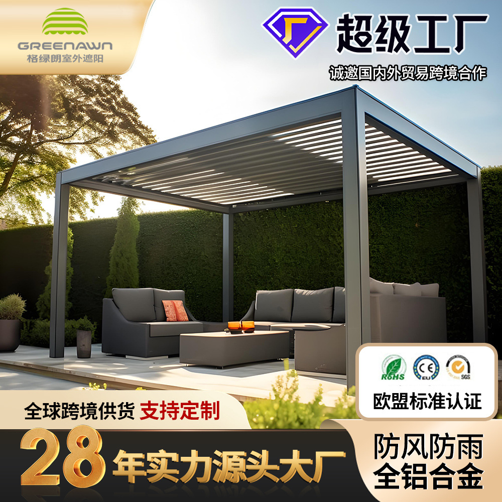 广东格绿朗节能科技有限公司28年源头大厂工厂欧美法式外国高级高端高品质跨境爆品电商出口院子里的全铝露台智能自动电动铝合金翻转百叶凉亭遮阳棚避雨棚亭子户外庭院铝制楼顶加凉棚防风防雨卷帘防晒停车棚防水耐腐3x3,3x4,3x6,4x4,4x6长方形园林观景休闲亭手摇露天定制厂家制造商