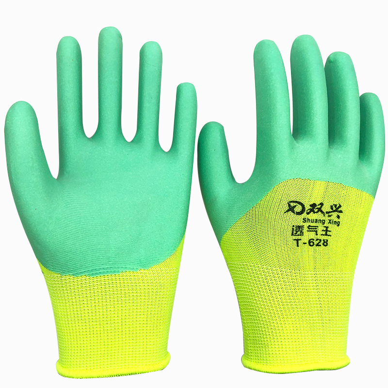Shuangxing T-628 통기성 킹 장갑 13 핀 나일론 형광 녹색 스티로폼 내마모성 미끄럼 방지 교수형 접착제 노동 보호 장갑