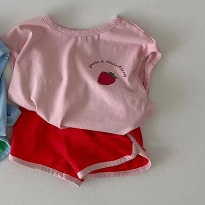 • 핑크 딸기 반팔 티셔츠 + 빨간 반바지