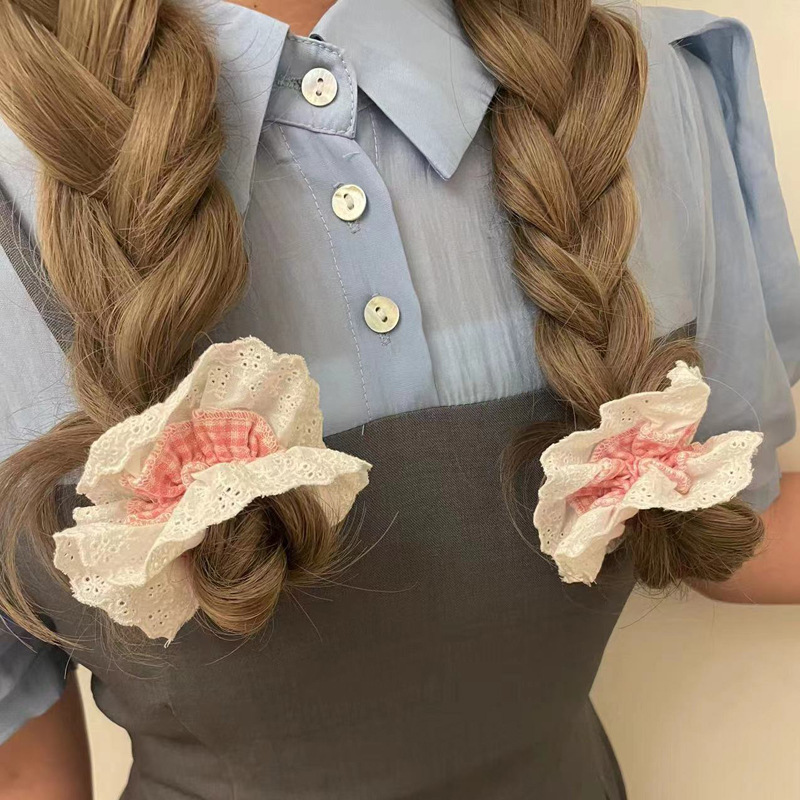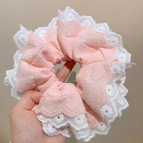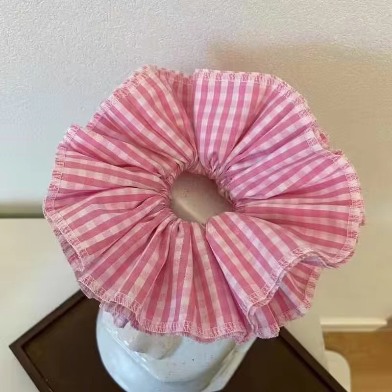 • 핑크 체크 무늬 케이크 레이스 머리끈