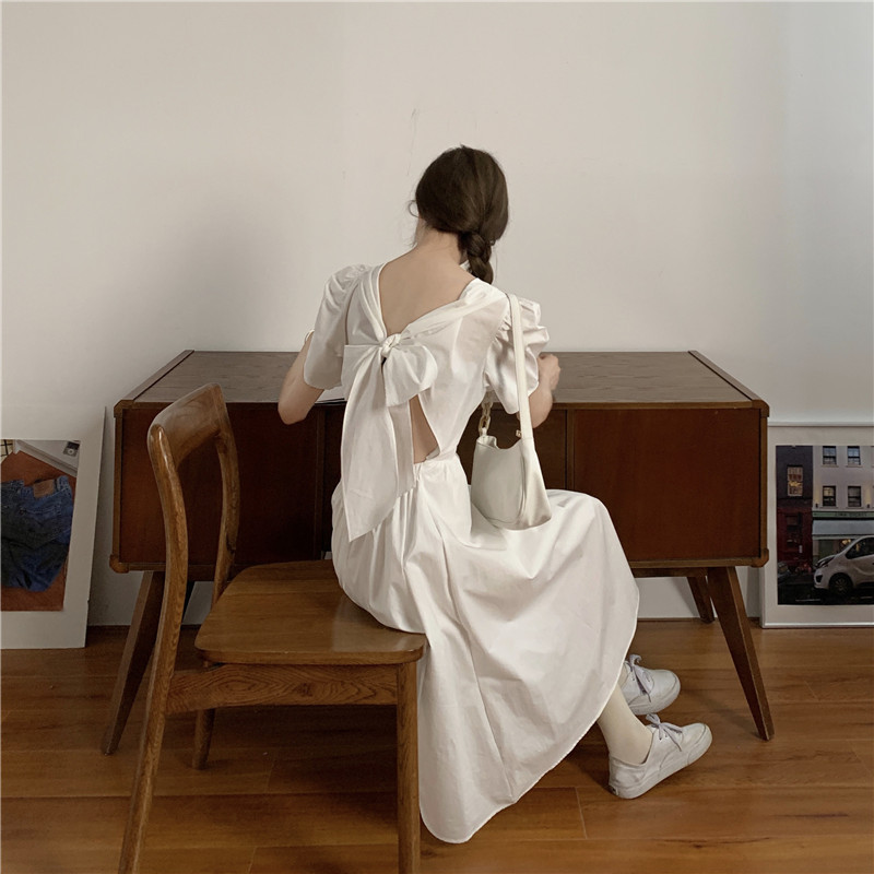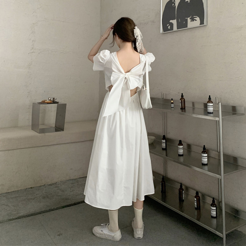 프랑스 틈새 백 중공 활 스커트 슈퍼 요정 모리 디자인 감각 허리 타이트 기질 화이트 원피스