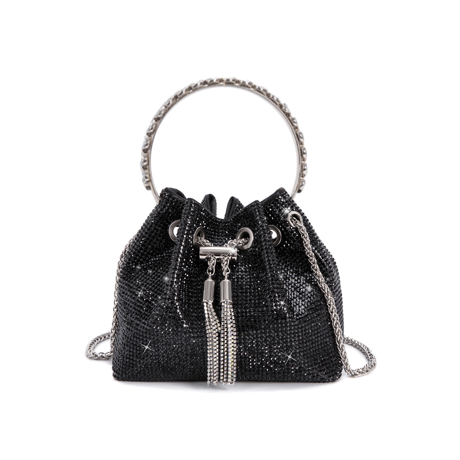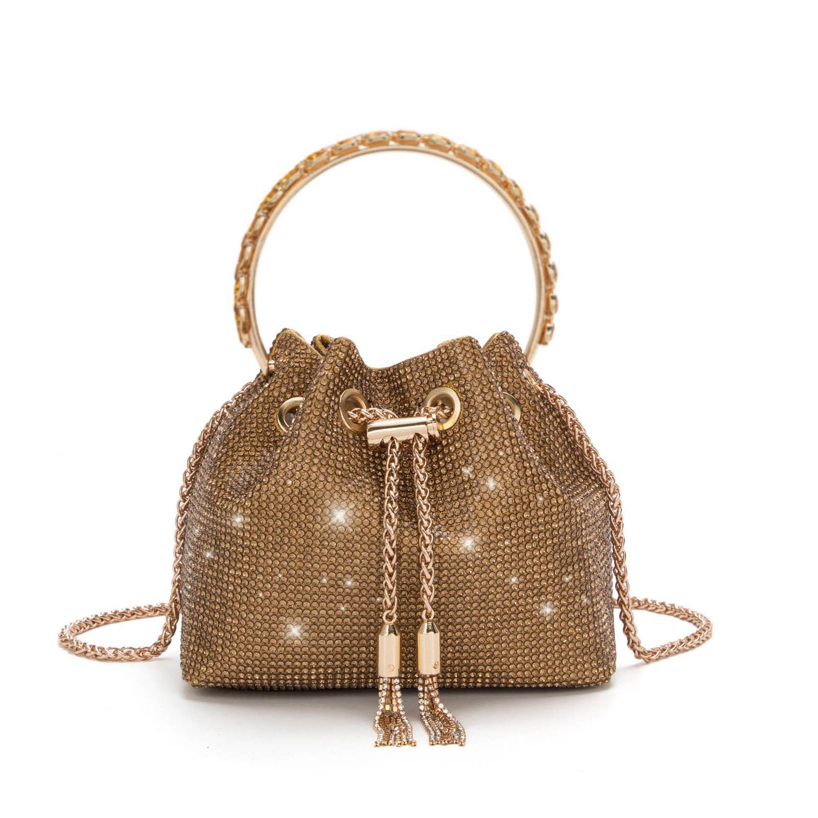 아마존 핫 셀러 다이아몬드 내장 밝은 크리스탈 드로 스트링 휴대용 작은 버킷 백 높은 질감 크로스 바디 작은 가방 세련된 이브닝 백스토어 가기