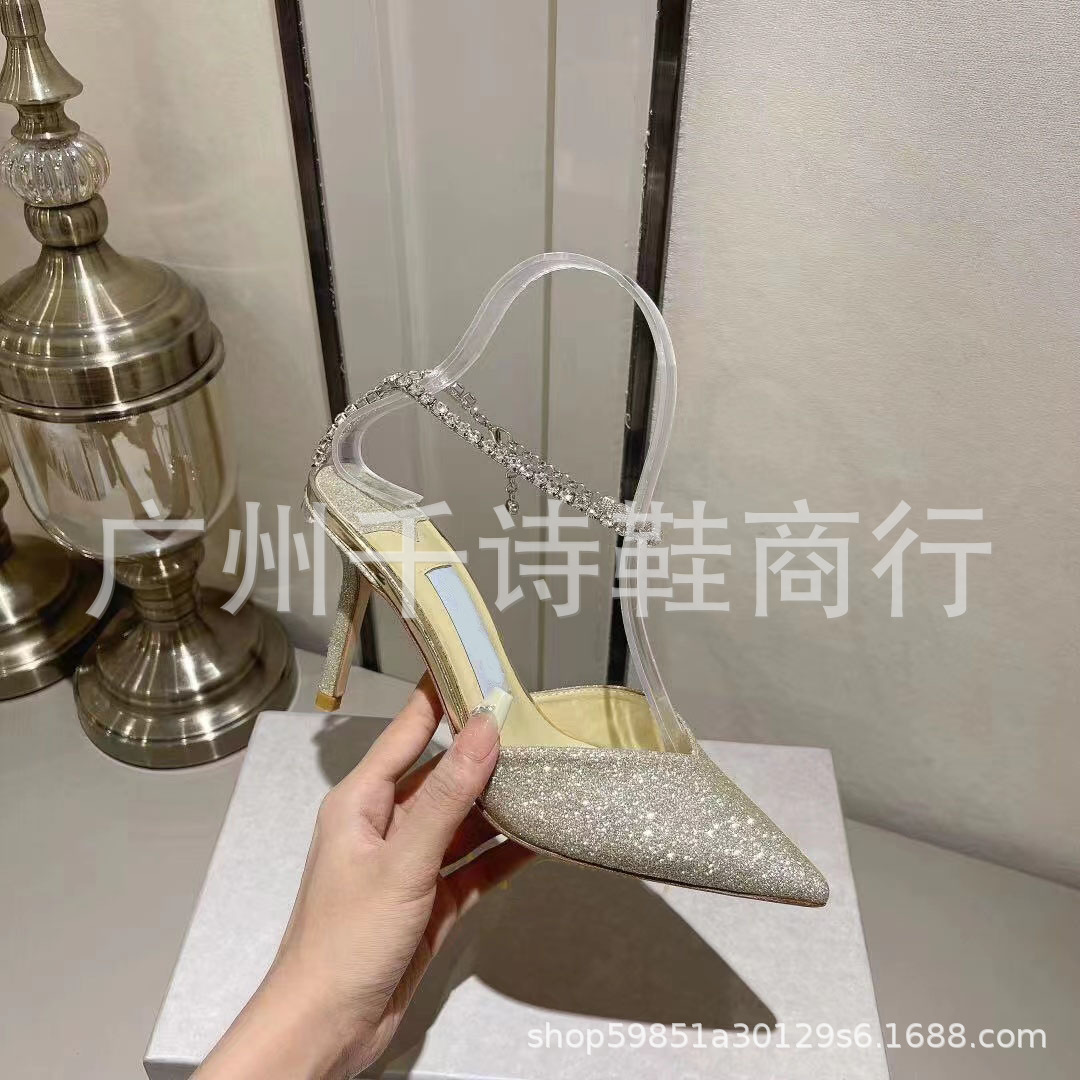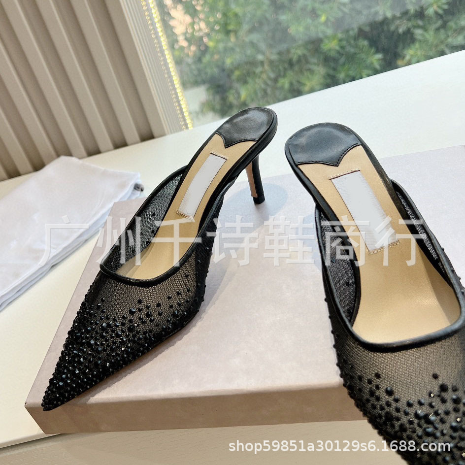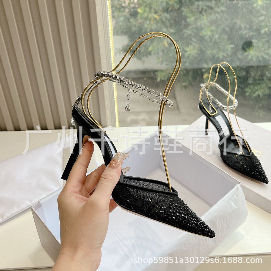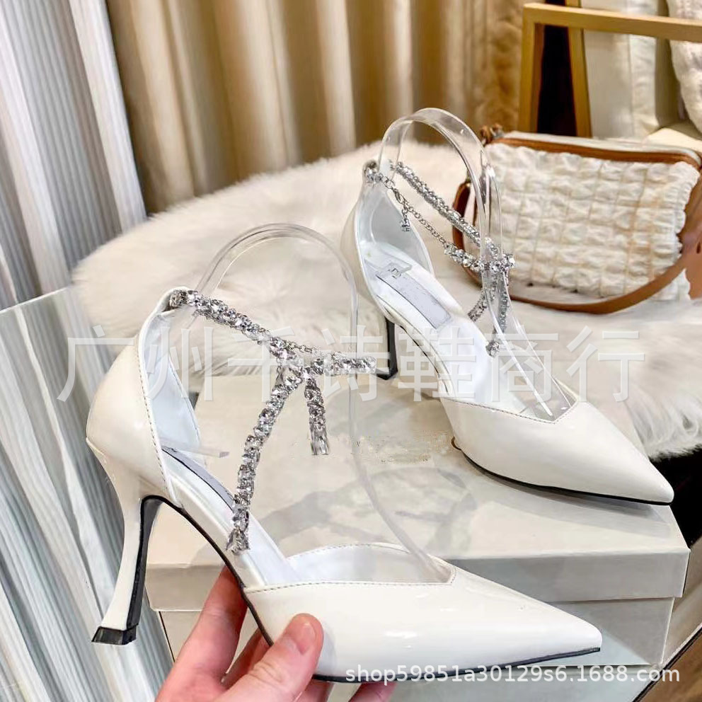 하이 버전 JC 한 단어 버클 라인스톤 샌들 여성 여름 새로운 뾰족한 얇은 굽 하이힐 가죽 얕은 입 크리스탈 신발스토어 가기