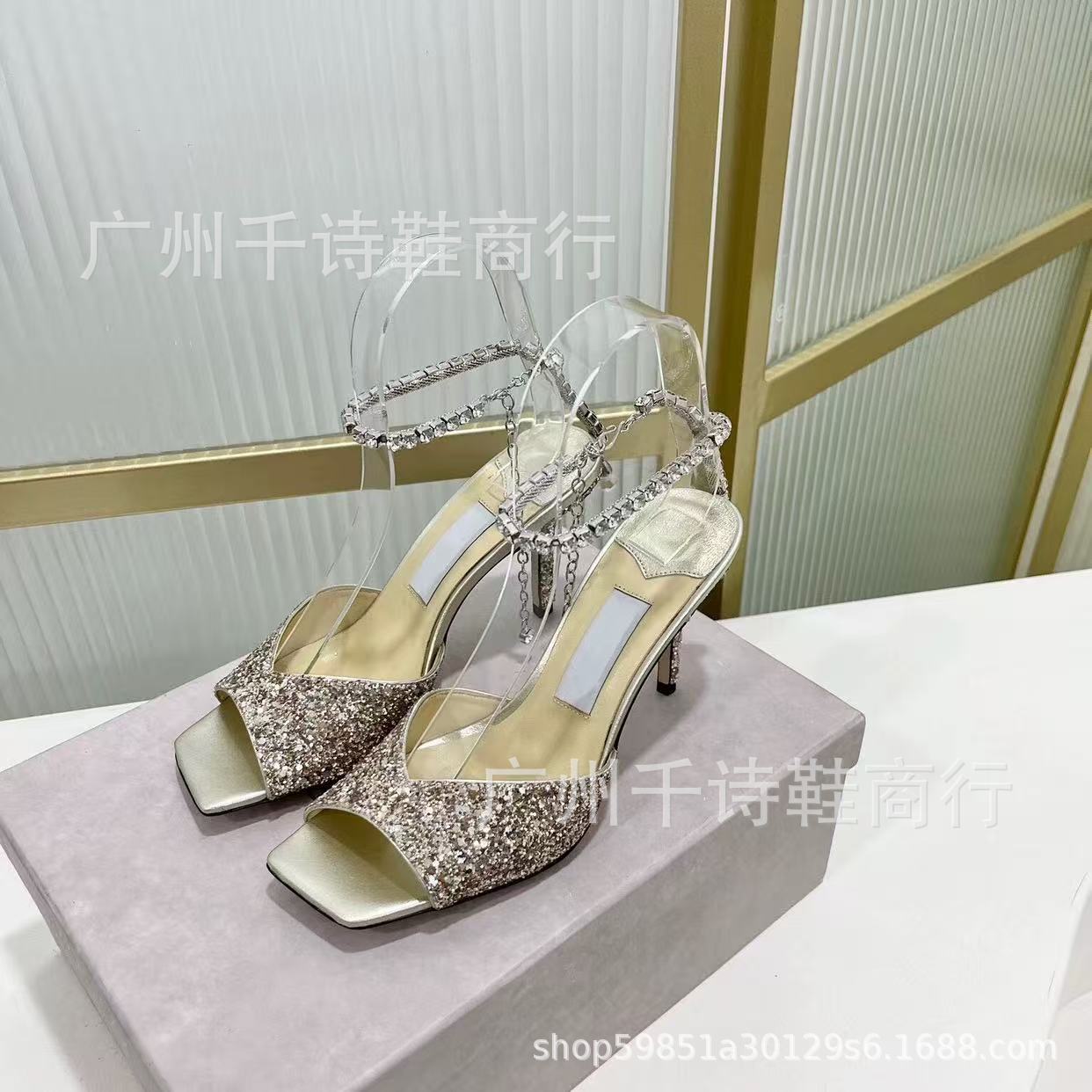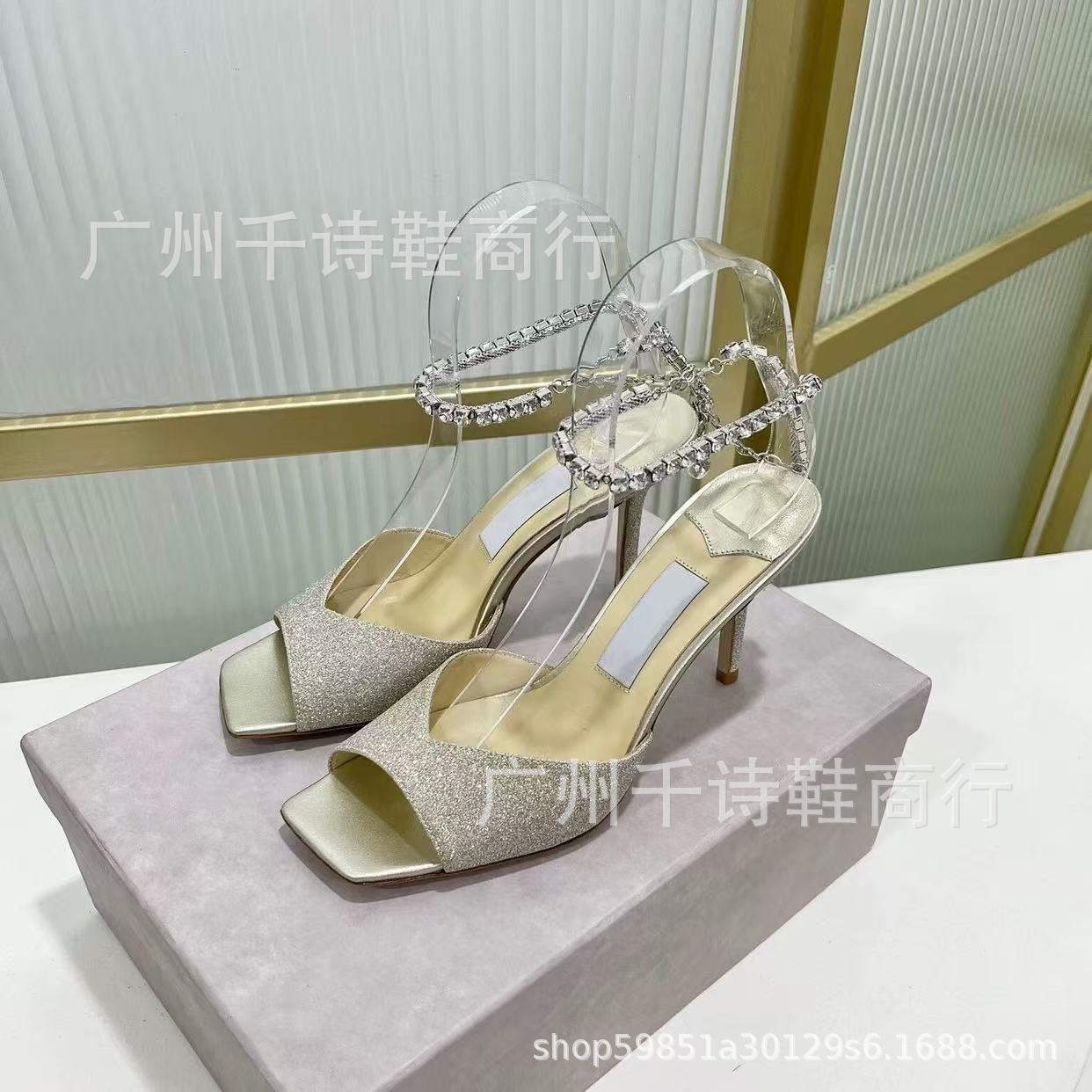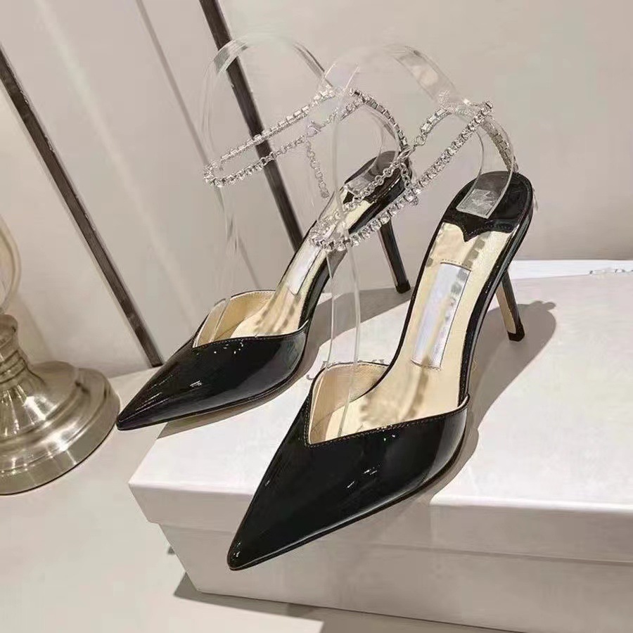 하이 버전 JC 한 단어 버클 라인스톤 샌들 여성 여름 새로운 뾰족한 얇은 굽 하이힐 가죽 얕은 입 크리스탈 신발스토어 가기