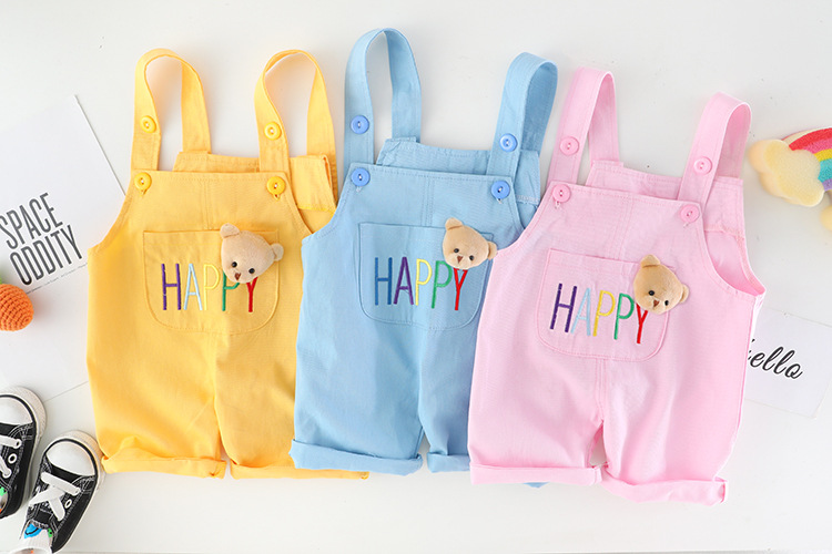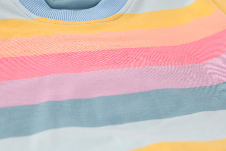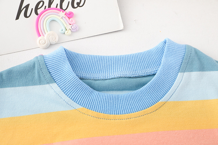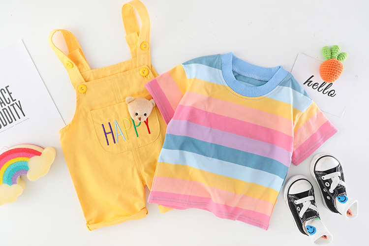 2023 여름 새로운 소년 소녀 캐주얼 멜빵 바지 투피스 세트 베이비 컬러 스트립 크루넥 반팔 세트 헤어스토어 가기
