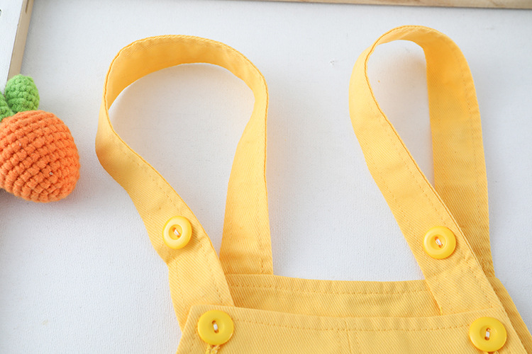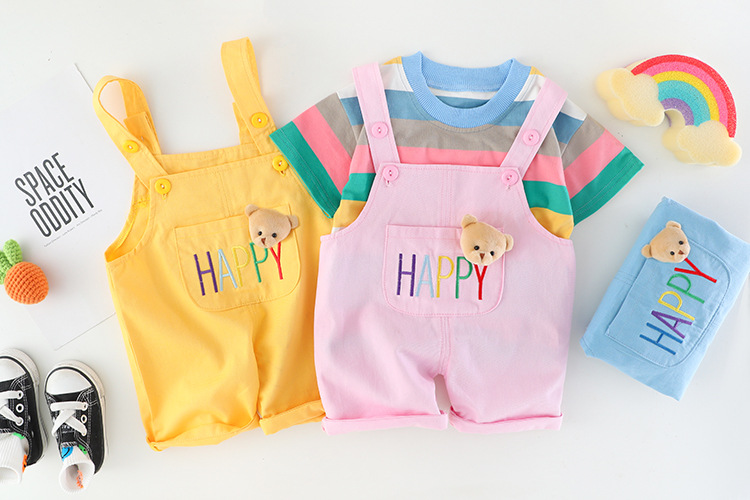 2023 여름 새로운 소년 소녀 캐주얼 멜빵 바지 투피스 세트 베이비 컬러 스트립 크루넥 반팔 세트 헤어