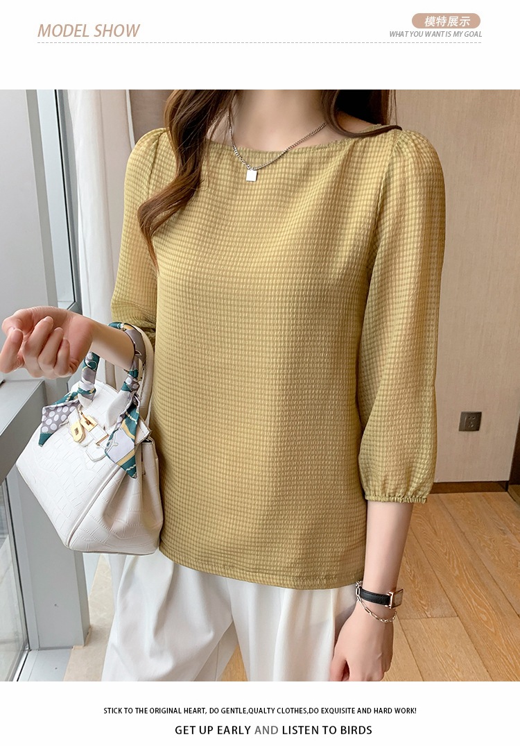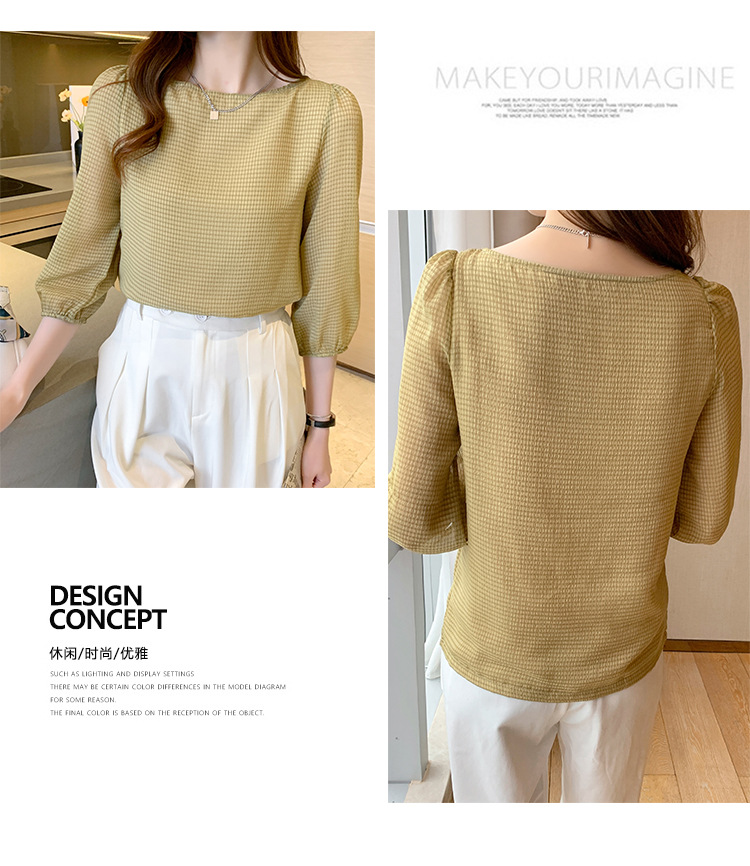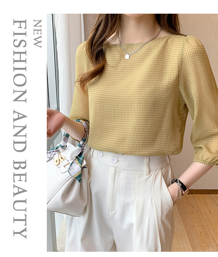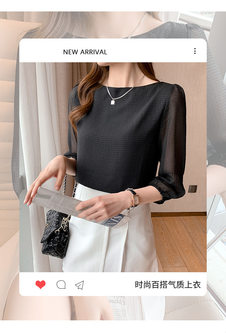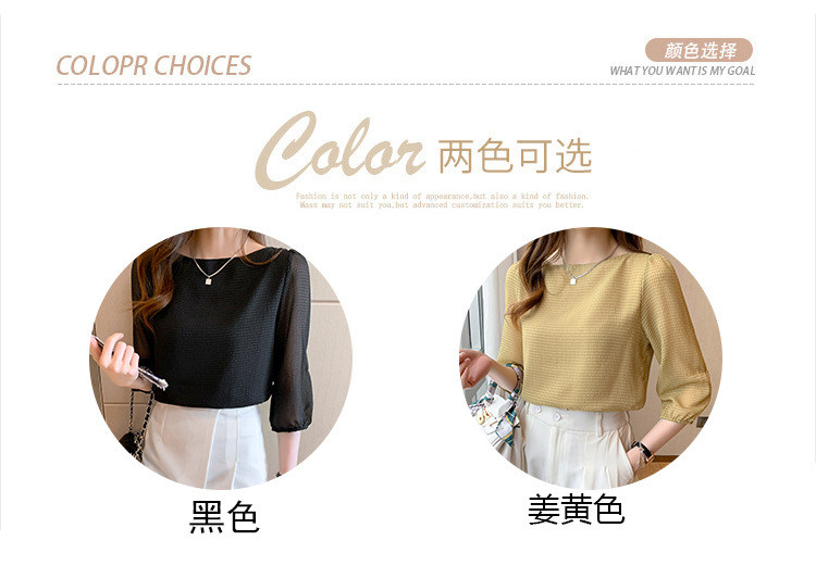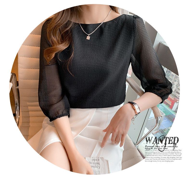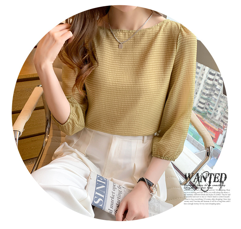2025년 신상 여름 여성용 셔츠, 세련된 7부 소매 패션 상의, 원라인 네크라인, 루즈핏 랜턴 소매 쉬폰 셔츠스토어 가기