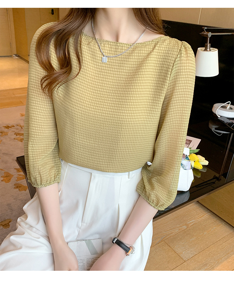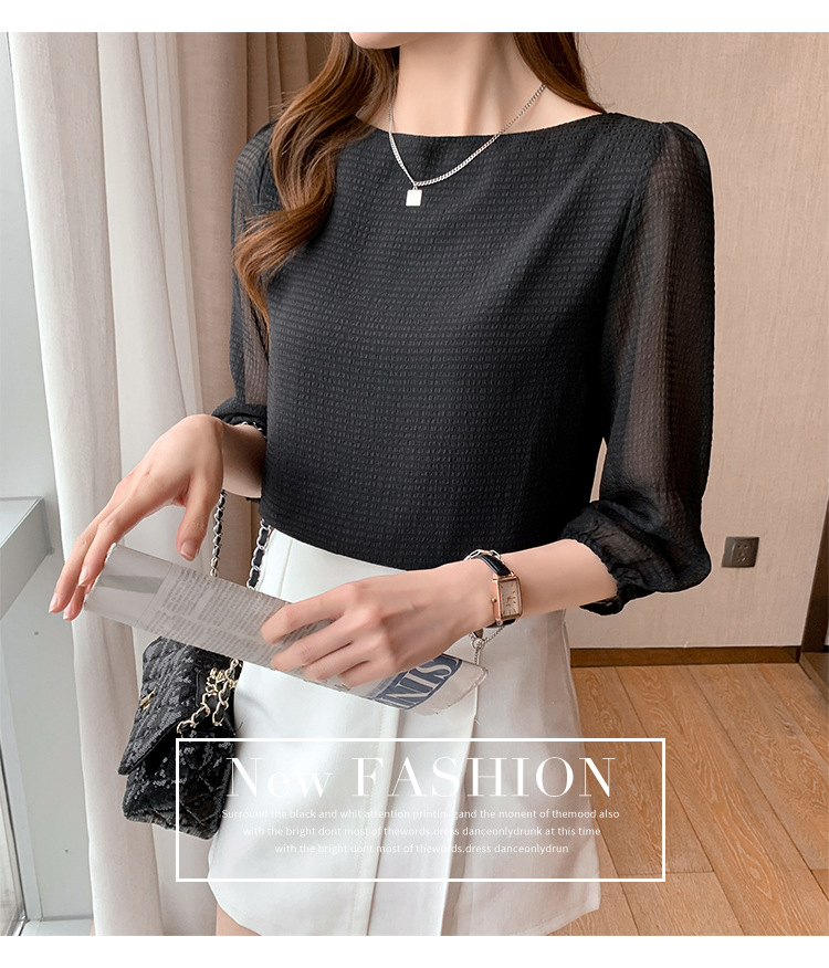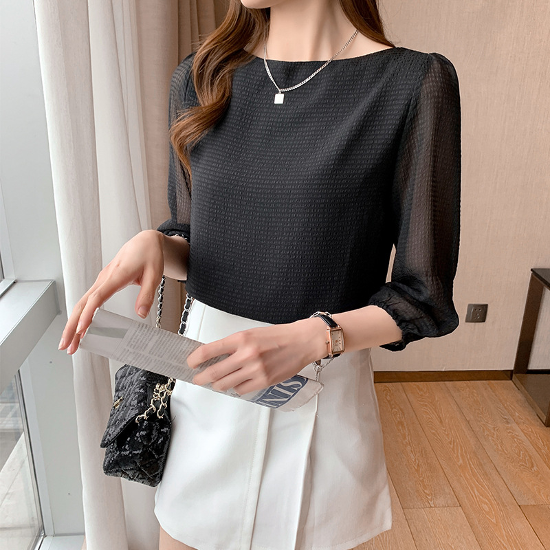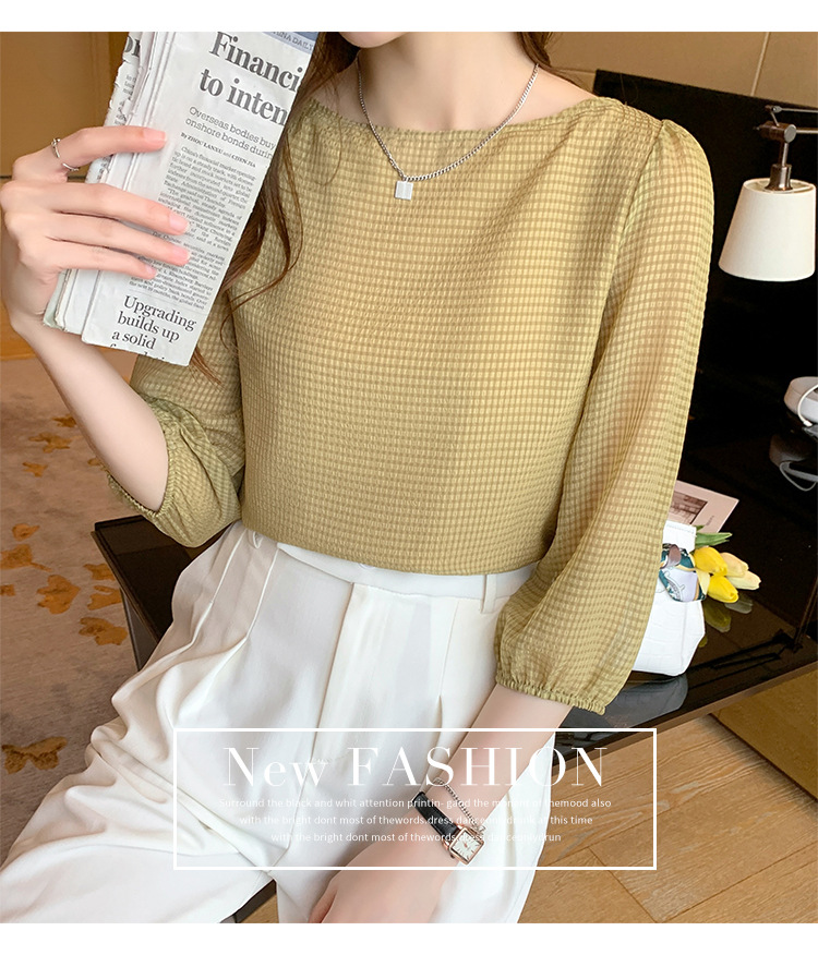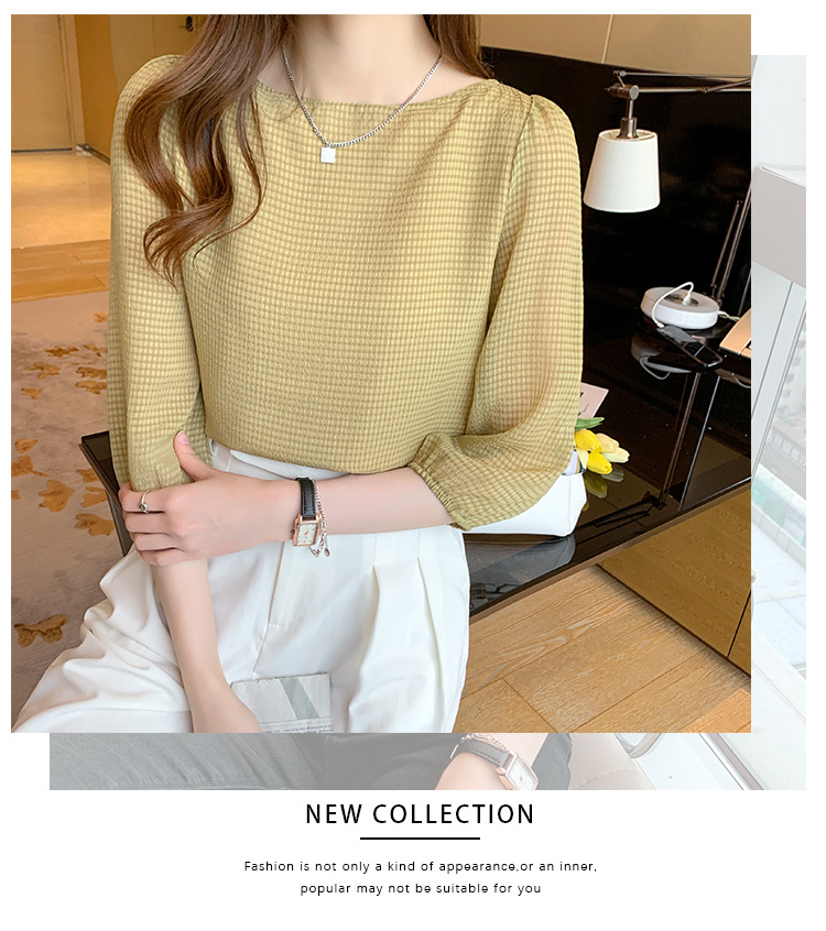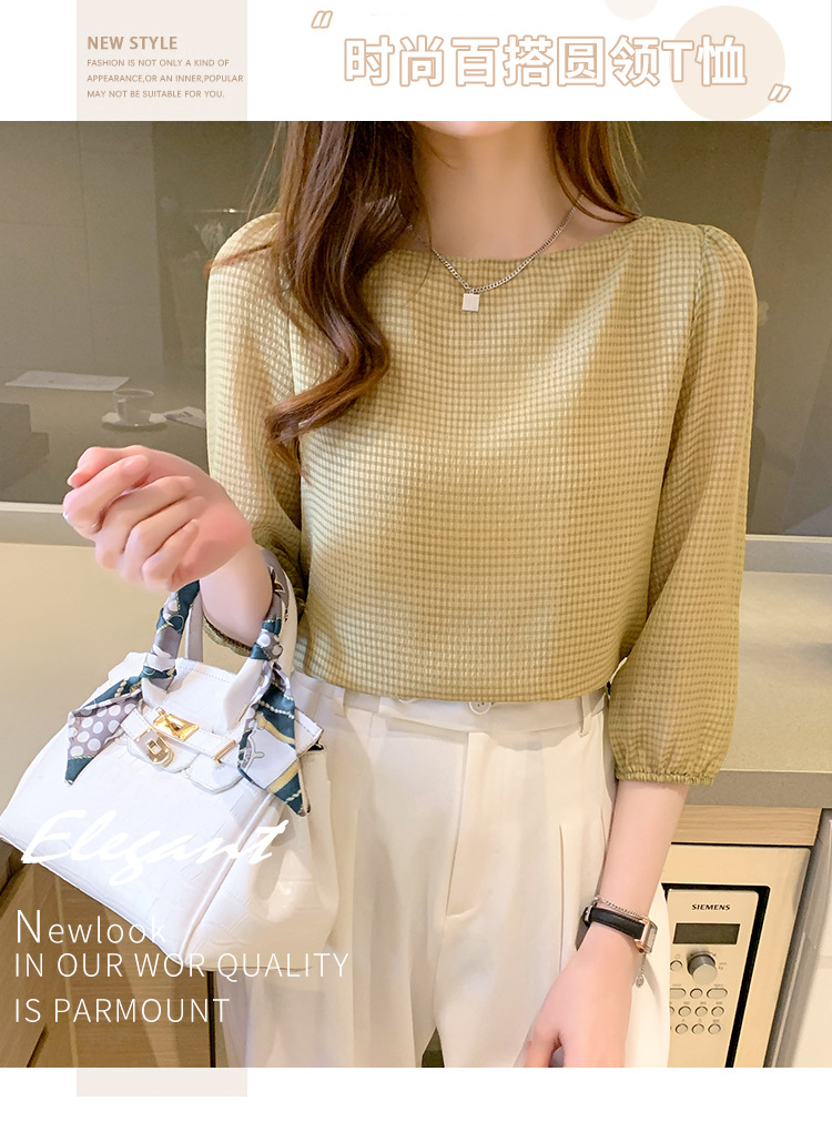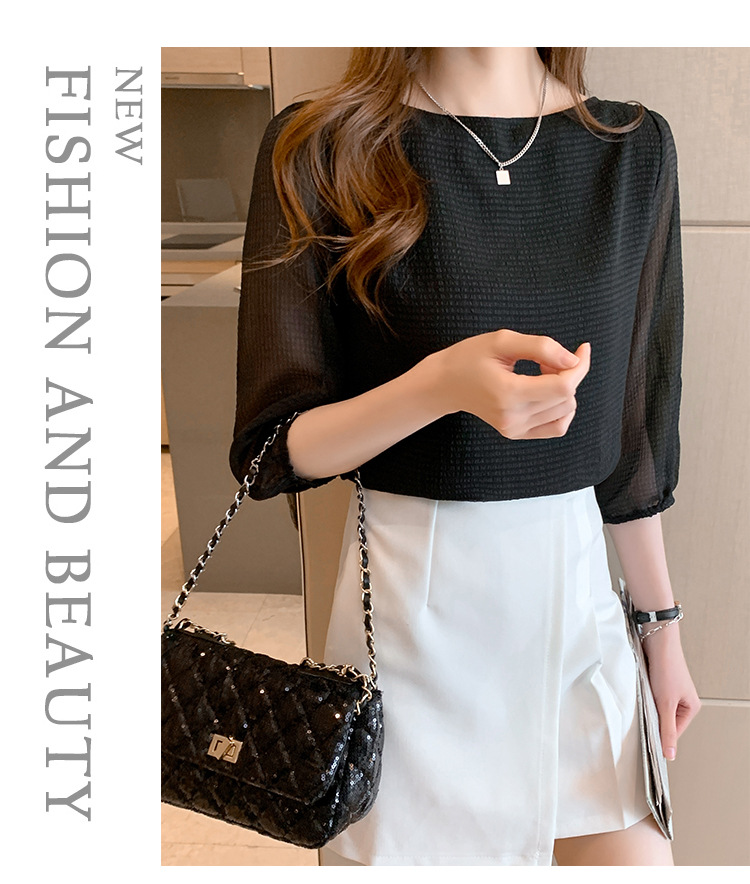 2025년 신상 여름 여성용 셔츠, 세련된 7부 소매 패션 상의, 원라인 네크라인, 루즈핏 랜턴 소매 쉬폰 셔츠스토어 가기
