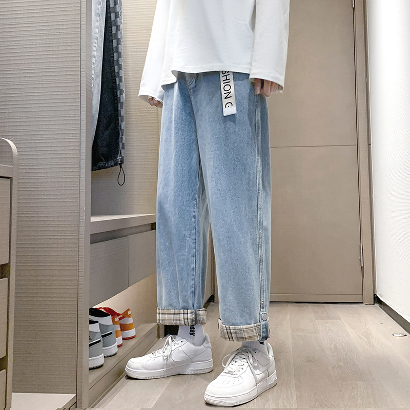 여름 새 청바지 남자의 복고풍 모든 매치 느슨한 스트레이트 와이드 레그 팬츠 홍콩 스타일 트렌디 브랜드 Ruffian 잘생긴 컬링 팬츠