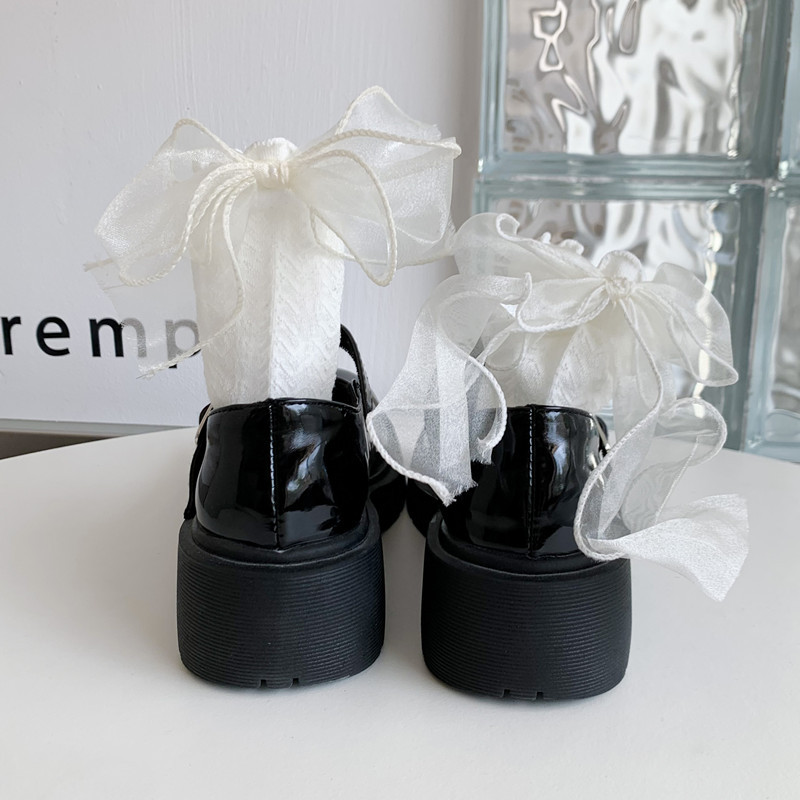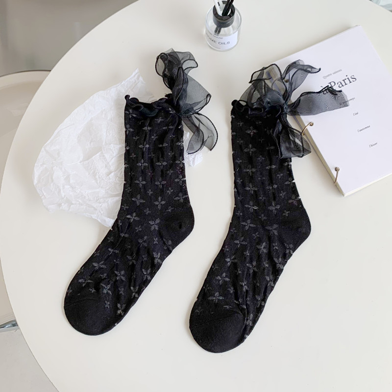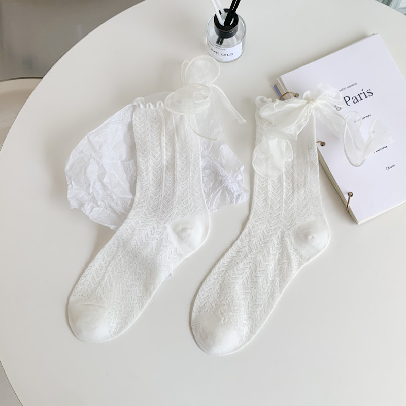 Bowknot 중반 송아지 양말 면화 봄과 여름 흰색 귀여운 치열한 남성 부드러운 소녀 유니폼 메쉬 요정 스타킹 Heel 레이스스토어 가기