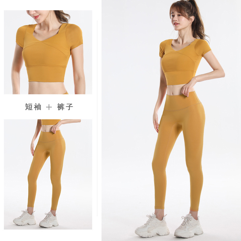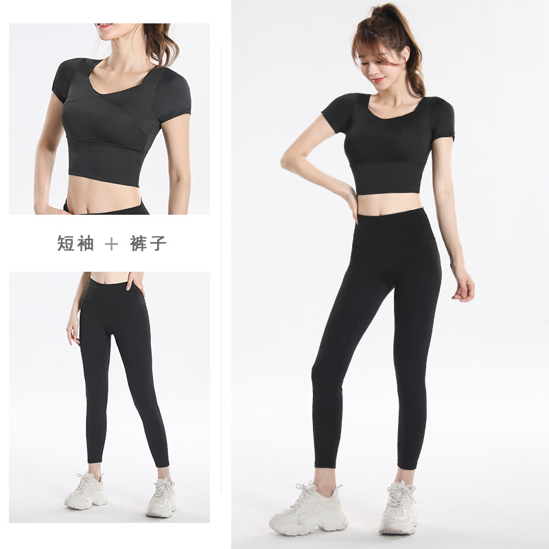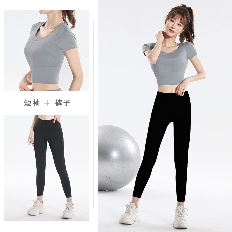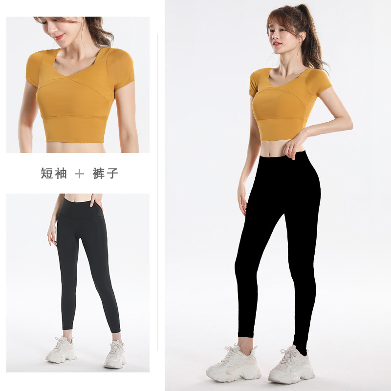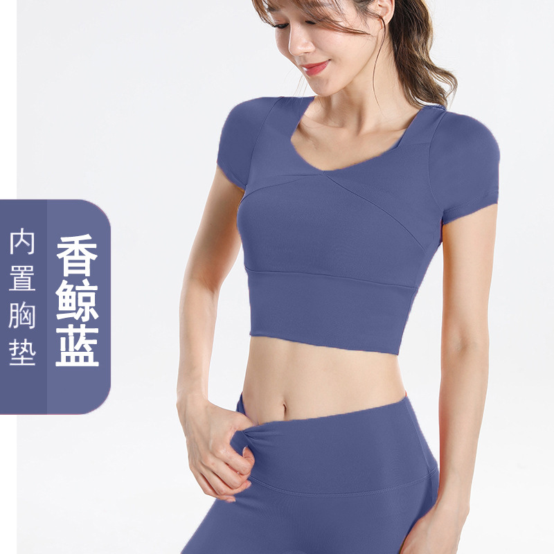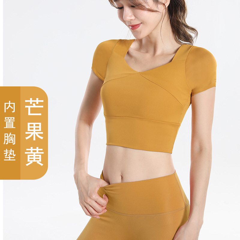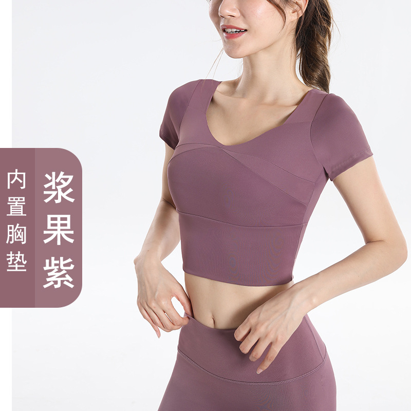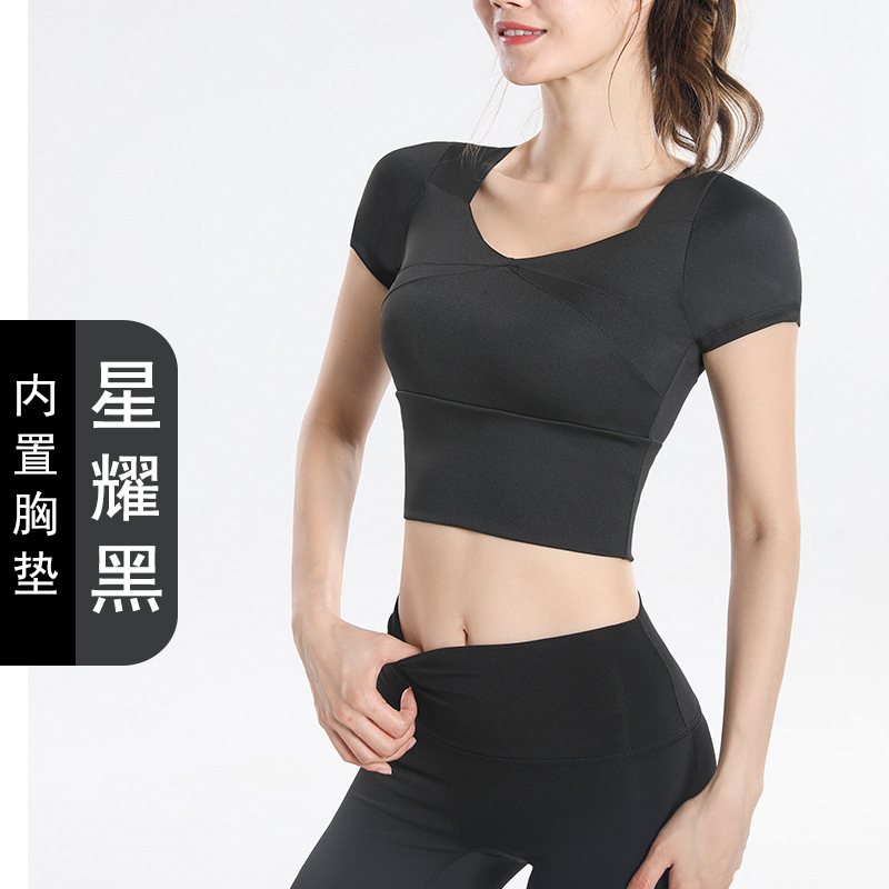 여성용 스포츠 탑, 가슴 패드가 있는 속건성 반팔 플러스 사이즈 요가복 2024 새로운 아침 달리기 피트니스 슈트 여름과 가을스토어 가기