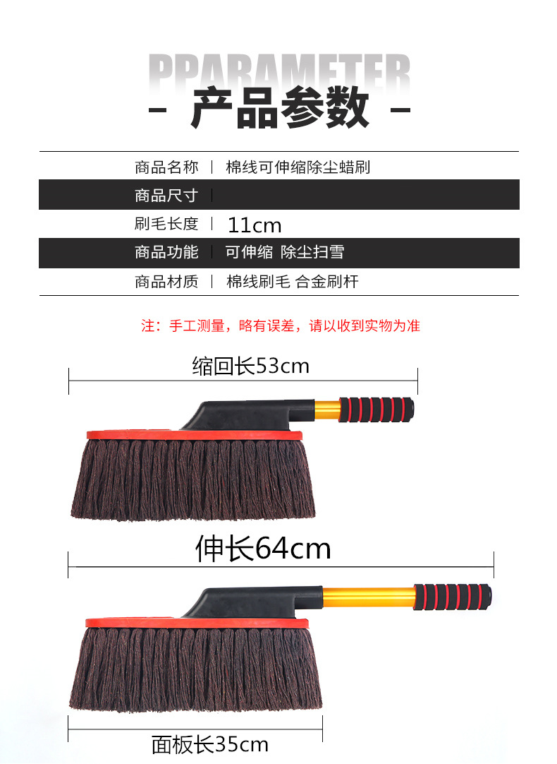 3、蜡刷掉毛现象:我们这个工厂采用机械植毛技术,通俗的说像牙刷一样纱线是打进刷板里,不会掉毛的。新刷子的纱线是机器裁切的,切面上会留有绒毛(浮毛)不可避免,但这个用几次就没有了(新车都需要磨合嘛);。再说了,蜡刷是个实用的扫灰工具,扫干净灰才是王道,对于细小绒毛非常敏感的买家,请慎重购买!