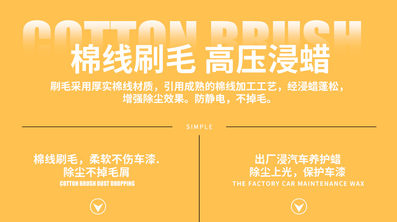 3、漆面潮湿或有水的情况下请勿使用,以免过多的灰尘黏附在纱线上,缩短蜡刷的寿命;