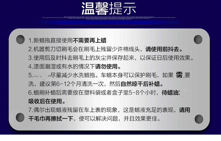 1、关于蜡痕:我们这个厂家采用的机械浸蜡技术,通俗地说纱线制作成刷子之前是在蜡液里浸泡的,制作的时候用机械剂掉多余的蜡液,这样的好处是蜡渗透的非常均匀,持久性很好,不用经常补充蜡。但是由于机械故障或者人工操作的因素,偶尔会有个别纱线上留的蜡偏多(这个发货时无法检查出来的),刚用的时候会局部形成蜡痕,像湿的一样。这种情况,只需要用干净的软毛巾擦掉即可,用几次就没有了,也可以放到阴凉通风处适当晾一下即可。至少大家可以放心,我们的蜡刷用的是蜡,蜡对车漆有益无害的。