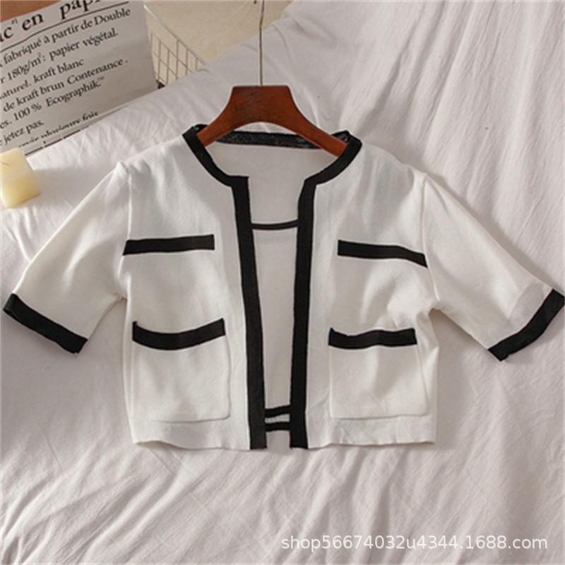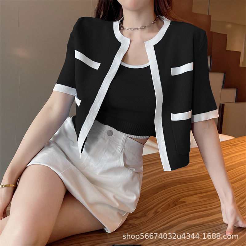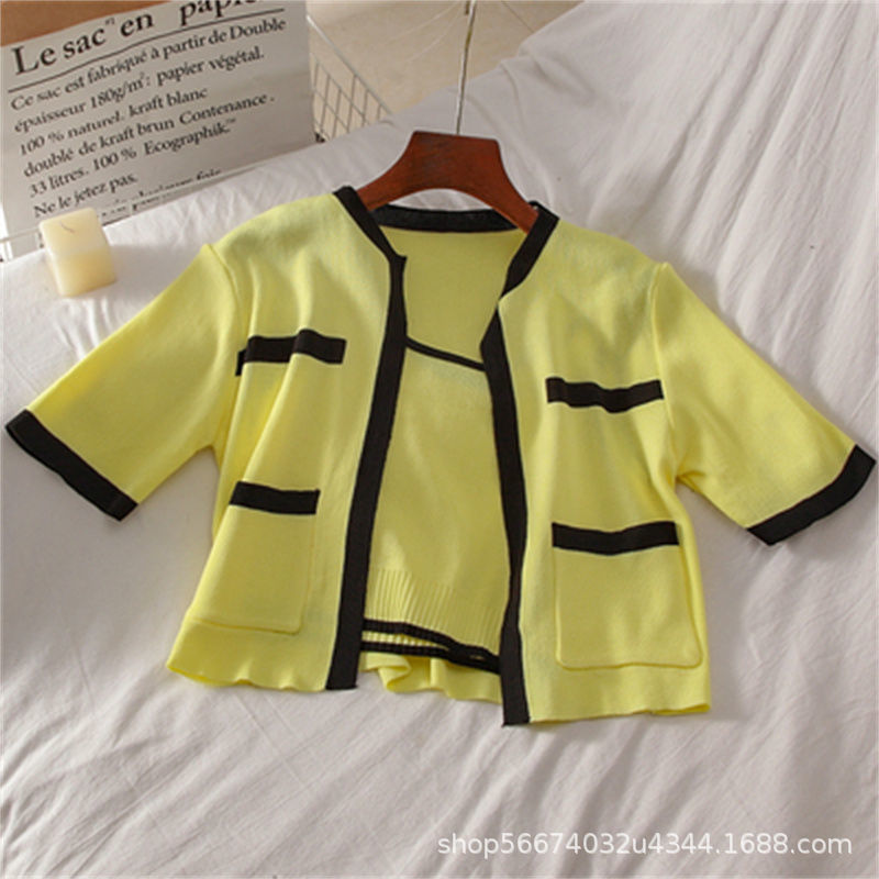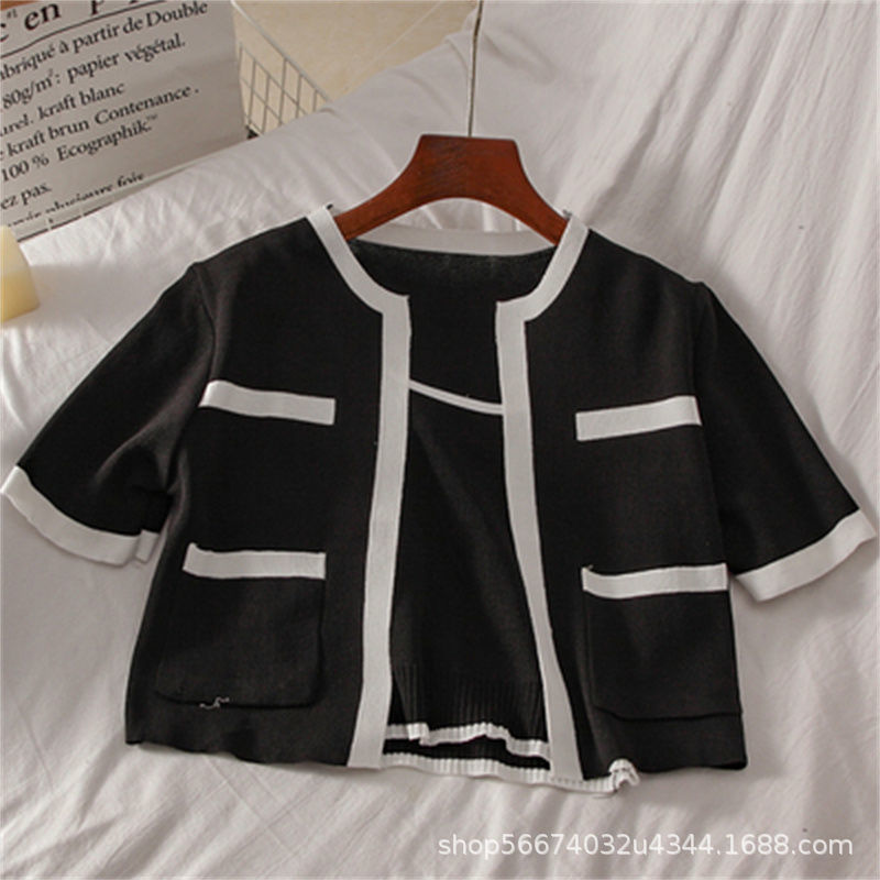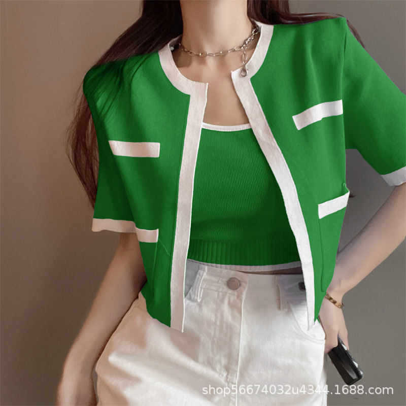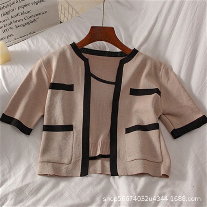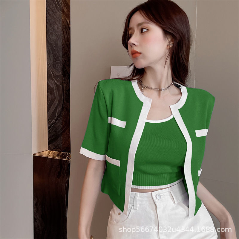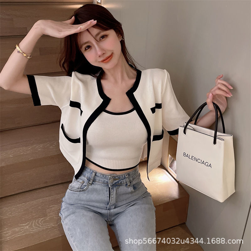 빈티지 컬러 매칭 반팔 니트 가디건 여성 세트 2023 여름 새로운 내부 짧은 슬링 탑 투피스 세트스토어 가기