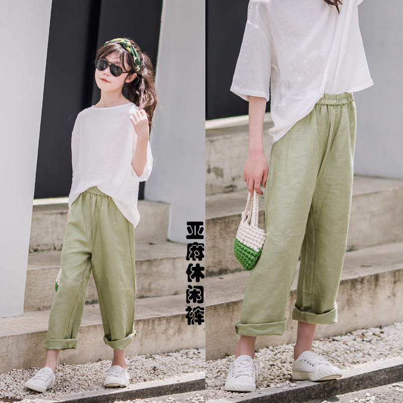 여아 린넨 반팔 티셔츠 바지 세트 아동 여름 서양 스타일 바지 캐주얼 바지 여성 여름 투피스 세트스토어 가기