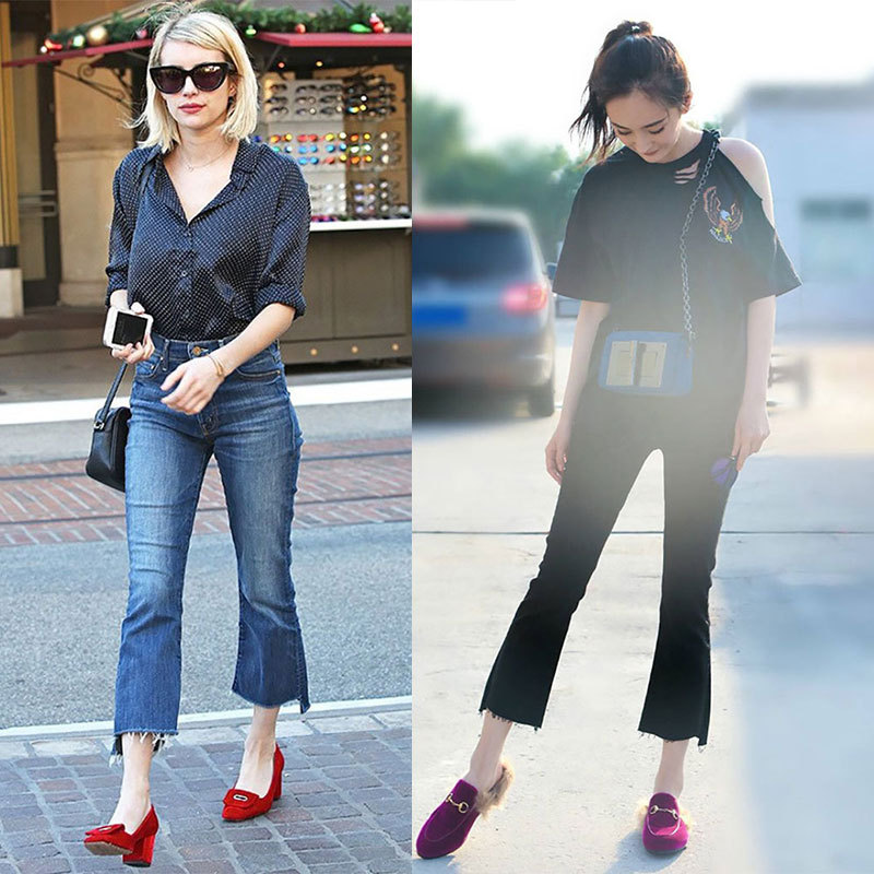 大幂幂同款MO弹力斜脚喇叭九分裤