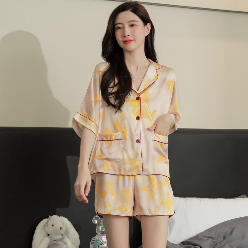 여름 청소년 한국식 아이스 실크 얇은 잠옷 반팔 반바지 세트 여성 실크 홈 의류 Tiktok 인터넷 축하스토어 가기