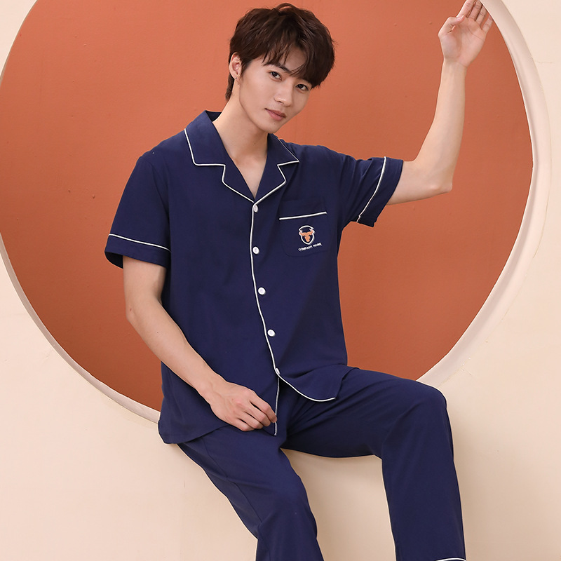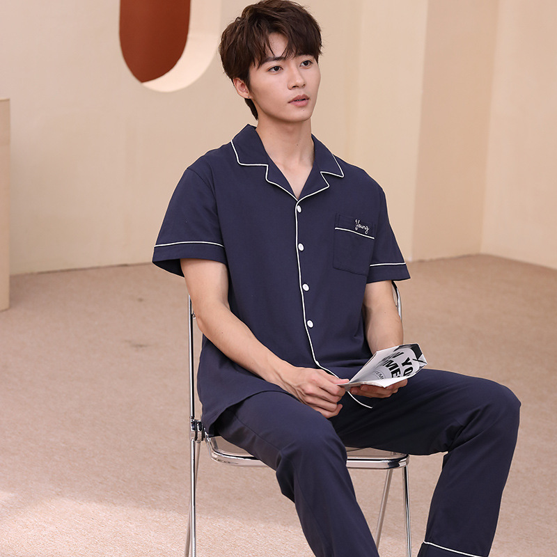 2022 봄과 여름 새로운 니트 면 남성 잠옷 반팔 가디건 편안한 면 남성 가정복 투피스 세트스토어 가기