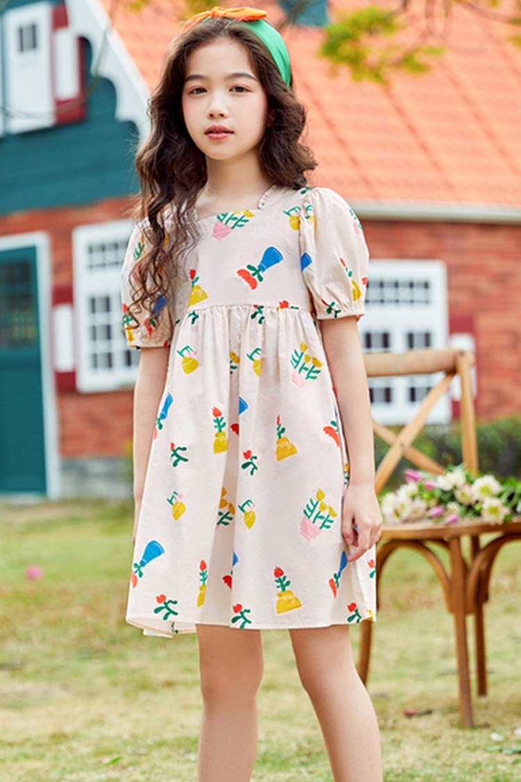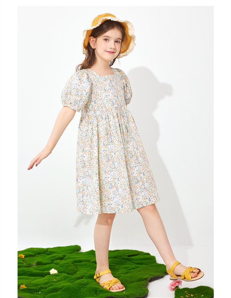 소녀의 원피스 공주 원피스 2022 여름 면 대형 어린이 아기 스퀘어 칼라 꽃 원피스 목가적 인 활